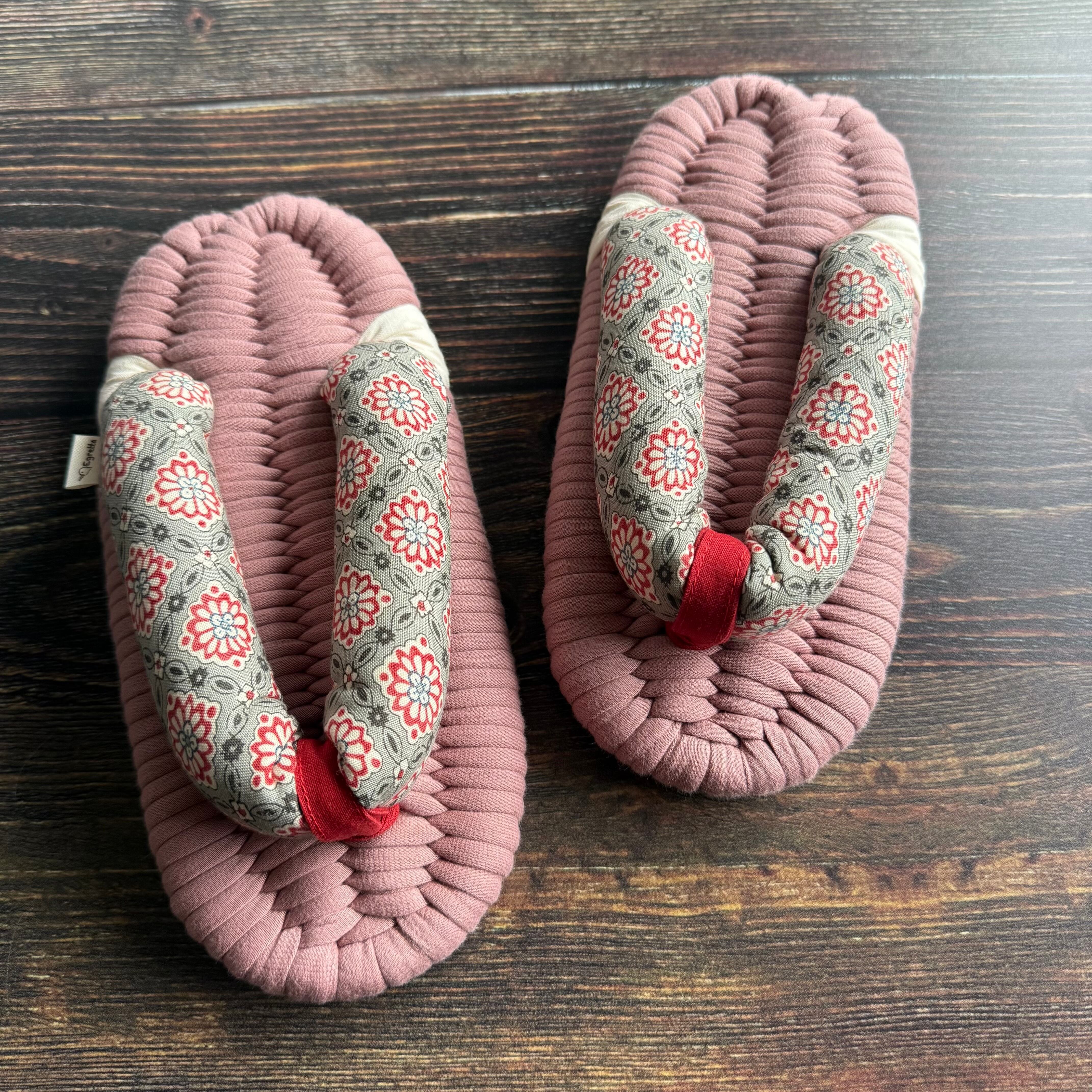 エグレッタの布ぞうりは、個性的で色鮮やかなUSAコットンで作られたふっくら鼻緒と、しっかりとした底の厚みが特徴の室内用布ぞうりです。