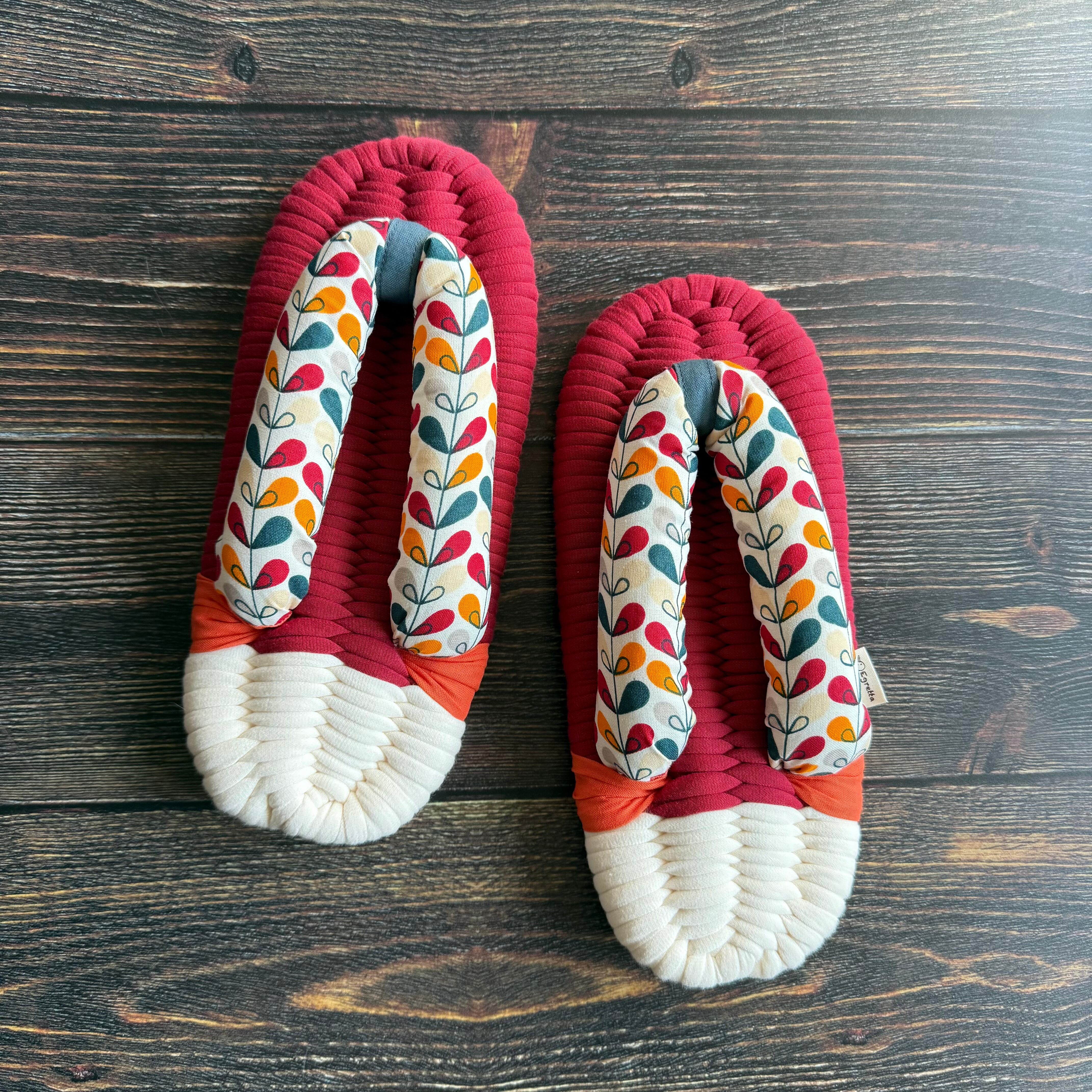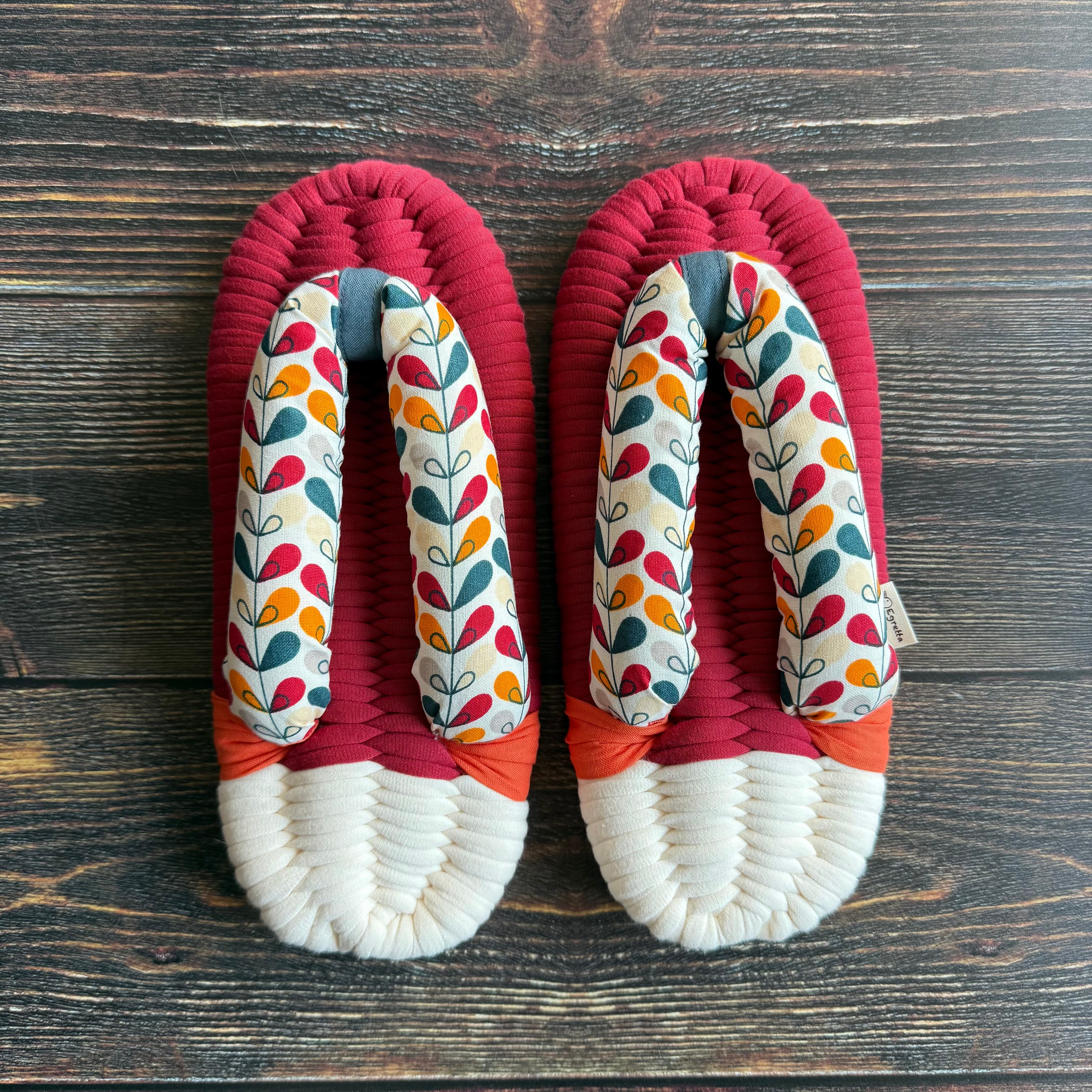 エグレッタの布ぞうりは、個性的で色鮮やかなコットンで作られたふっくら鼻緒と、しっかりとした底の厚みが特徴の室内用布ぞうりです。