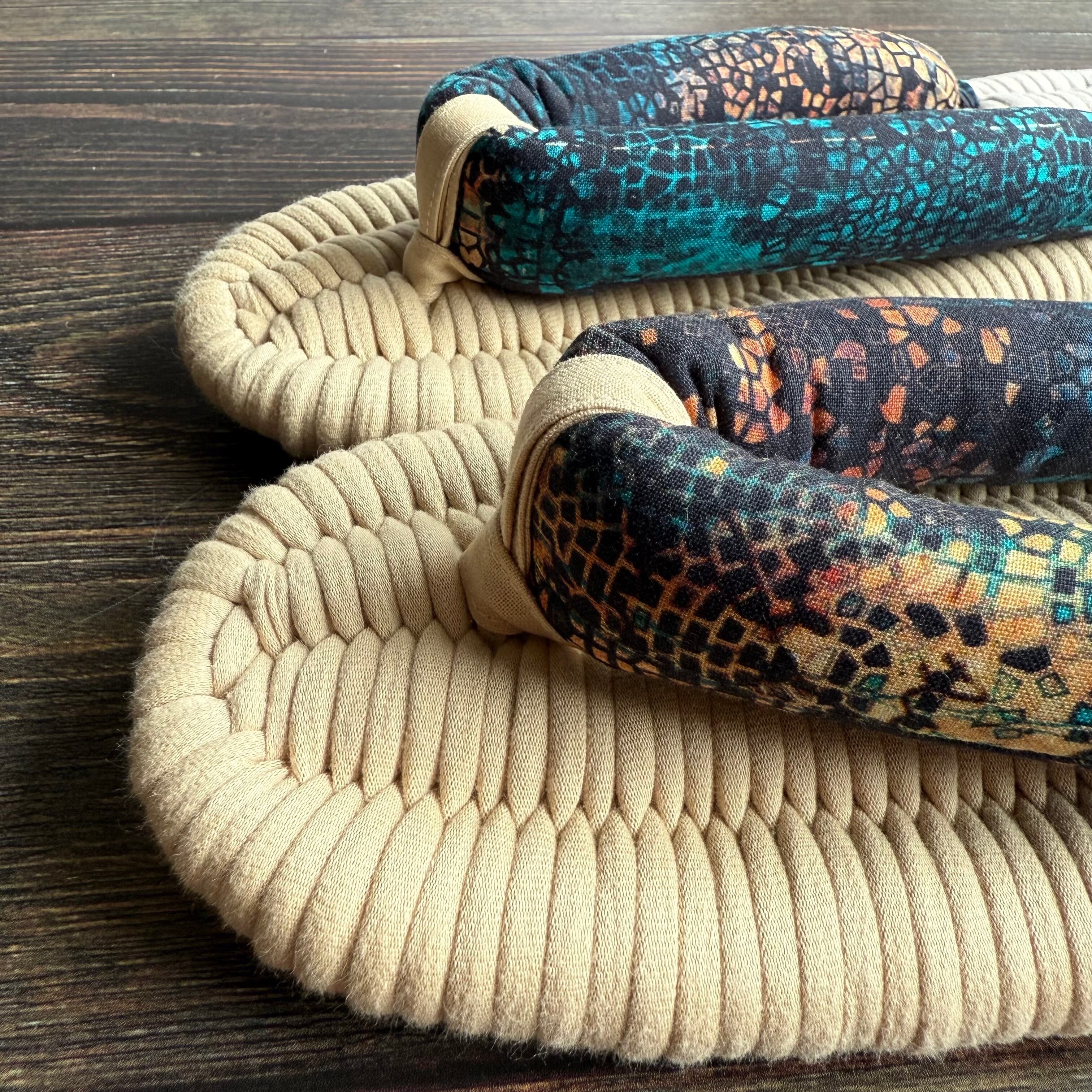 エグレッタの布ぞうりは、個性的で色鮮やかなコットンで作られたふっくら鼻緒と、しっかりとした底の厚みが特徴の室内用布ぞうりです。