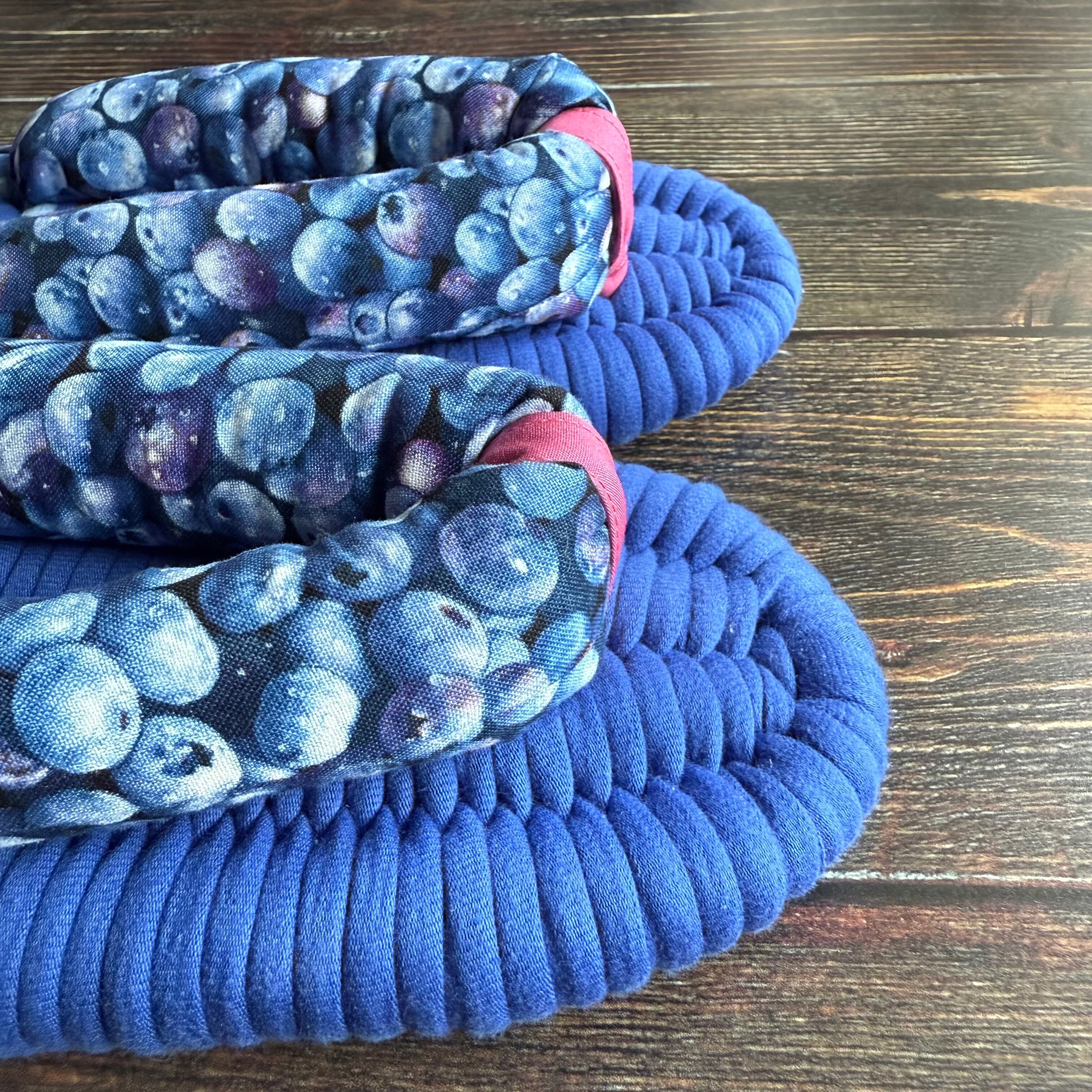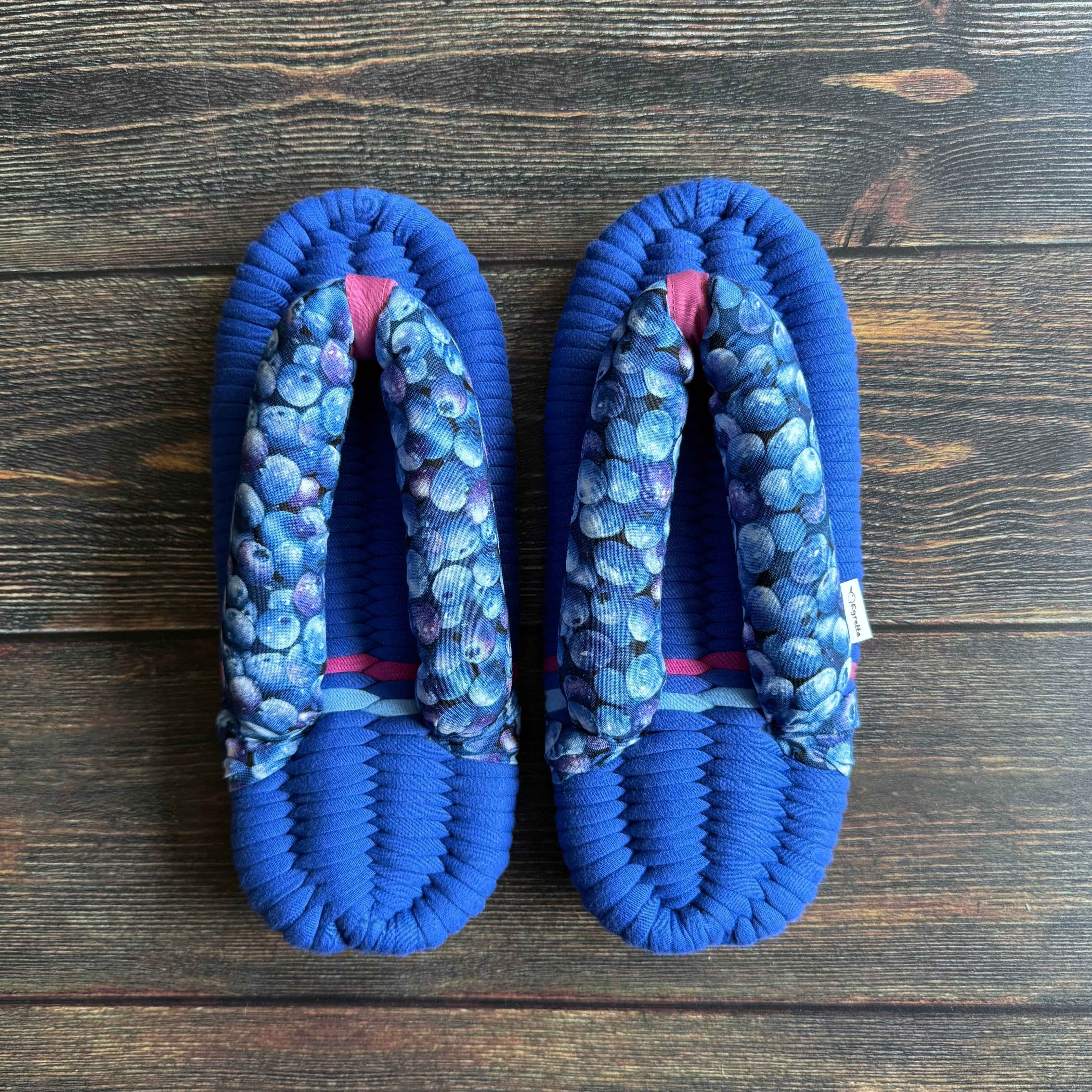 まるで本物のようなブルーベリー柄。前坪のローズピンクの差し色が効いています。