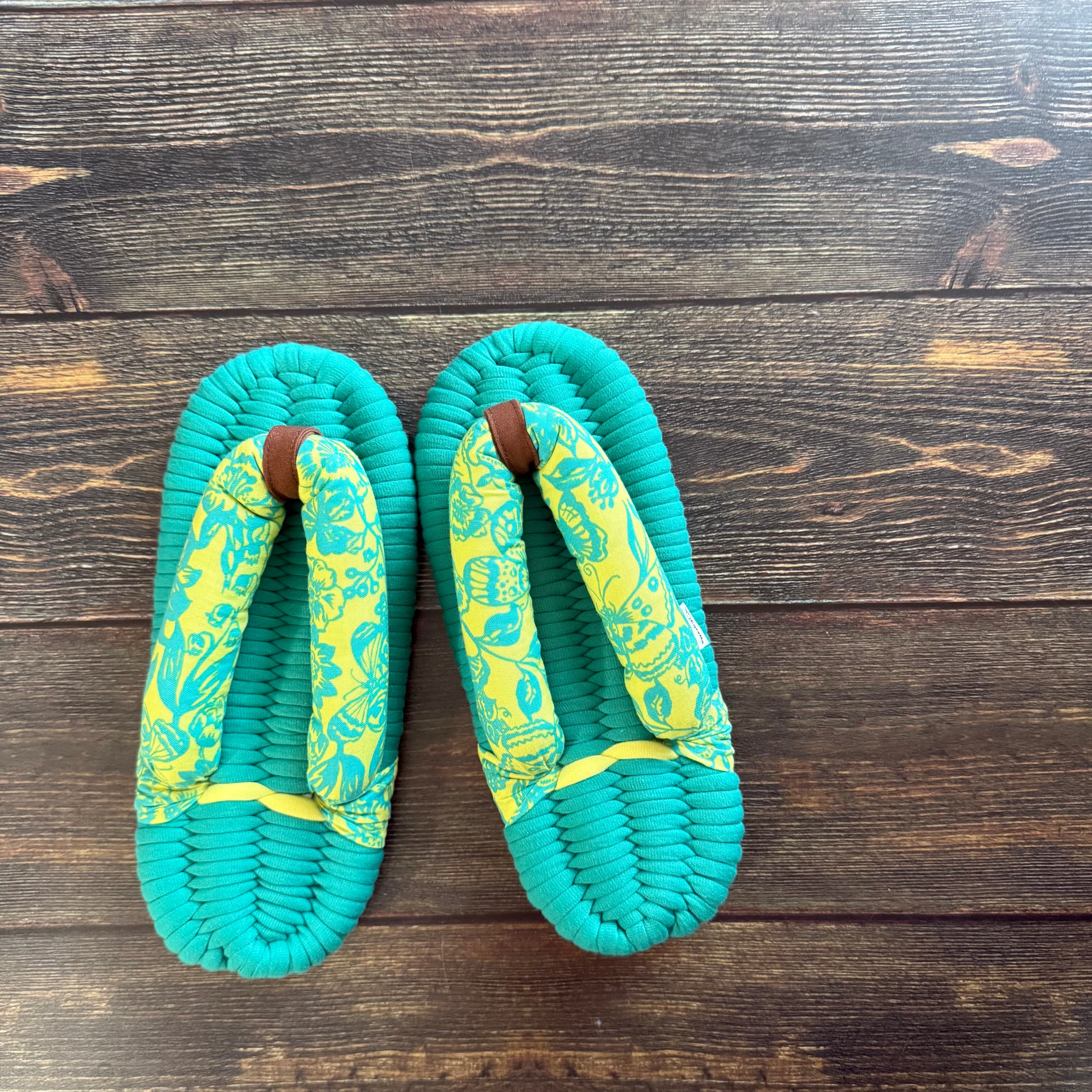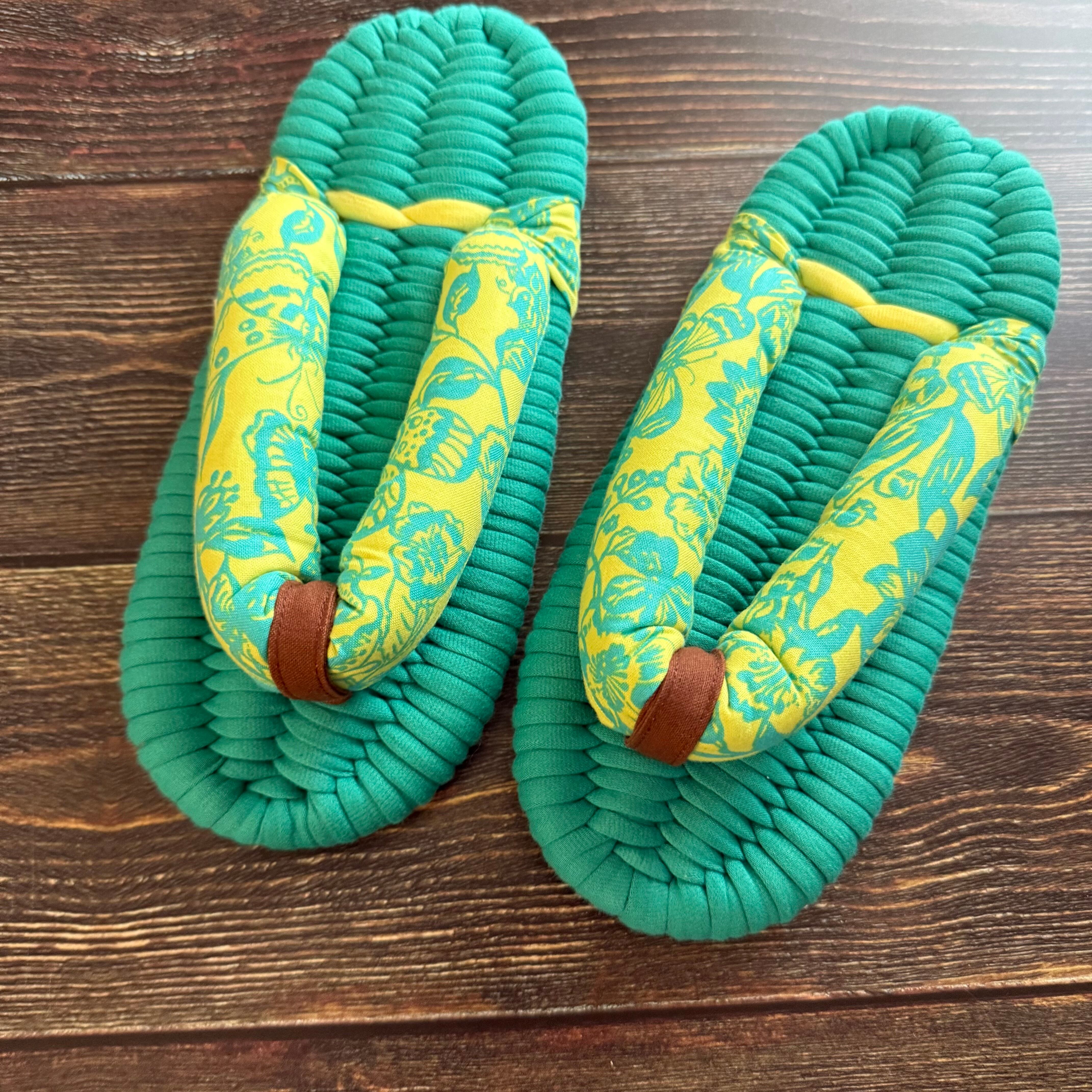 エグレッタの布ぞうりは、個性的で色鮮やかなUSAコットンで作られたふっくら鼻緒と、しっかりとした底の厚みが特徴の室内用布ぞうりです。