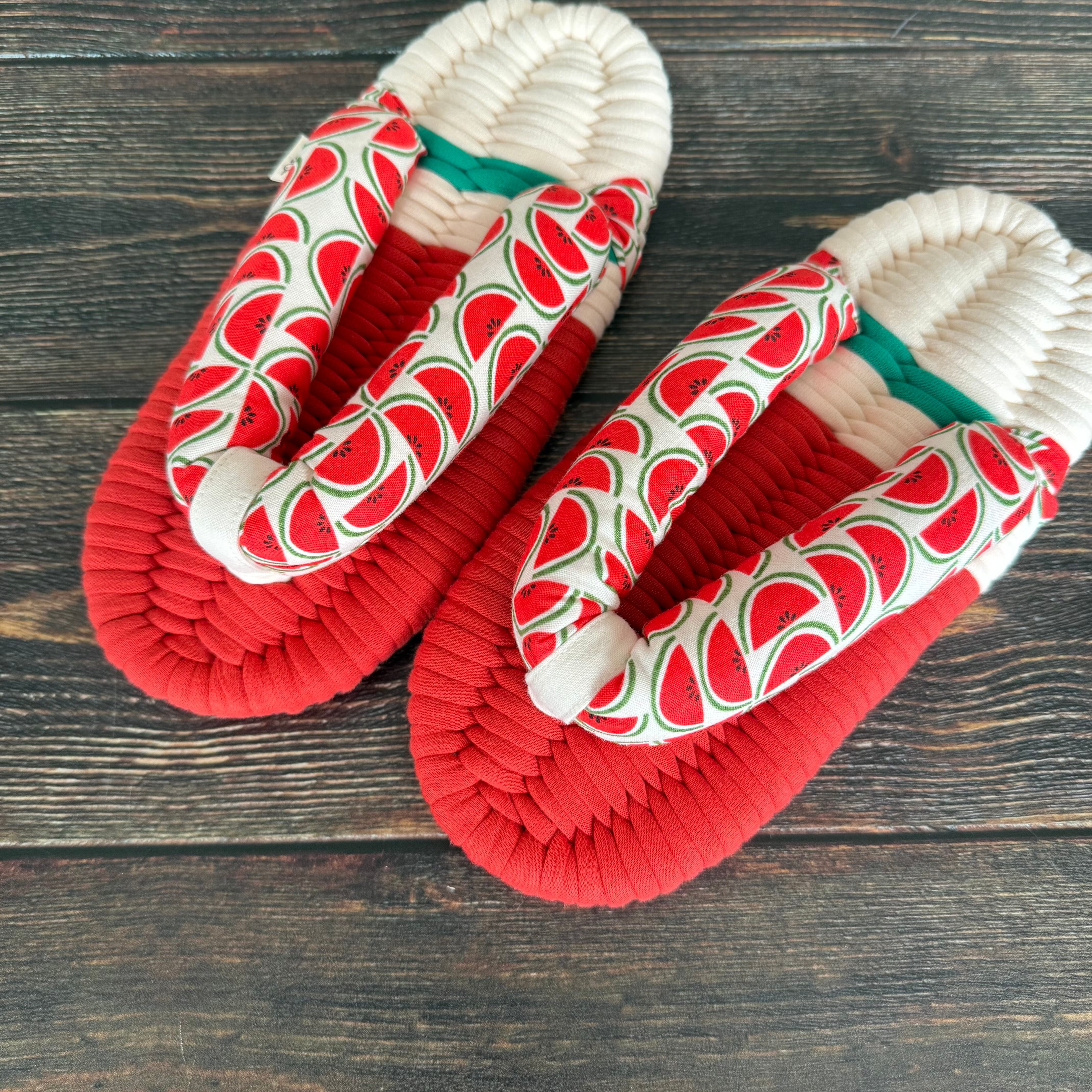 Moda社のあざやかなレッドのスイカ柄の生地で鼻緒を作りました。Moda社はテキサス州ダラスを拠点とするファブリックブランドです。年間で1200柄を超える新作を次々にリリースし多彩なバリエーションで魅了し続けています。見ているだけで元気になれそうなPOPなデザインです。