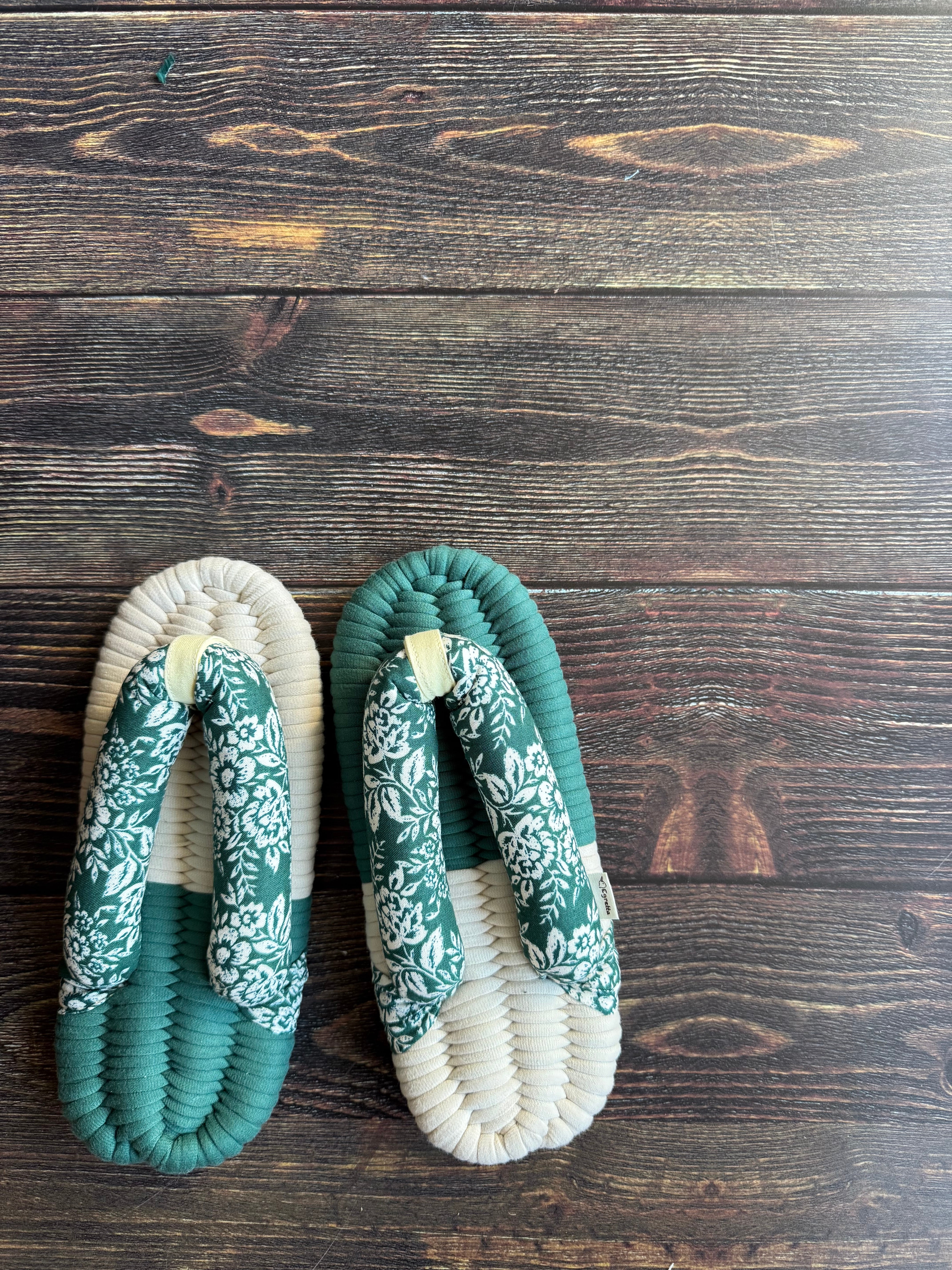 エグレッタの布ぞうりは、個性的で色鮮やかなUSAコットンで作られたふっくら鼻緒と、しっかりとした底の厚みが特徴の室内用布ぞうりです。
