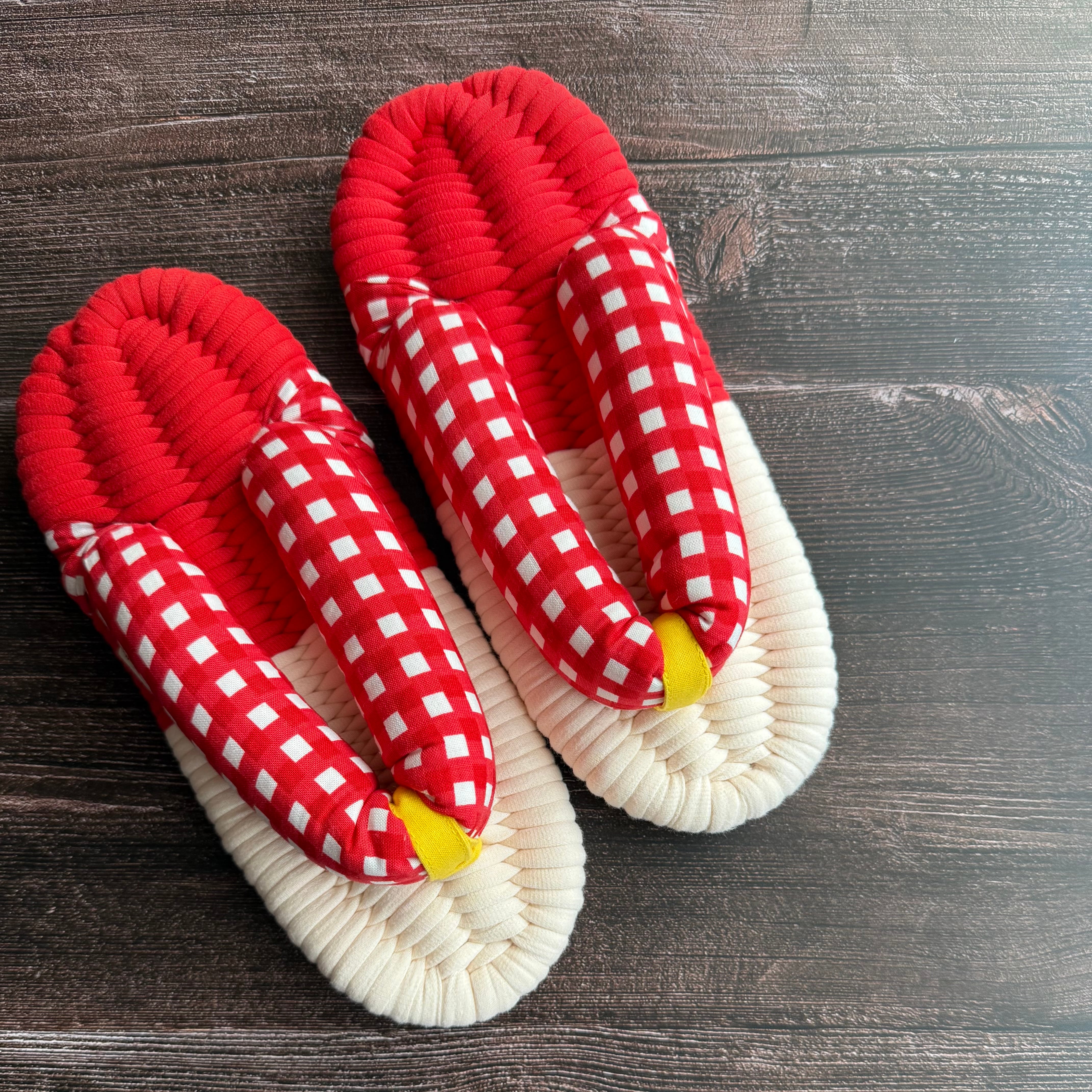 エグレッタの布ぞうりは、個性的で色鮮やかなUSAコットンで作られたふっくら鼻緒と、しっかりとした底の厚みが特徴の室内用布ぞうりです。