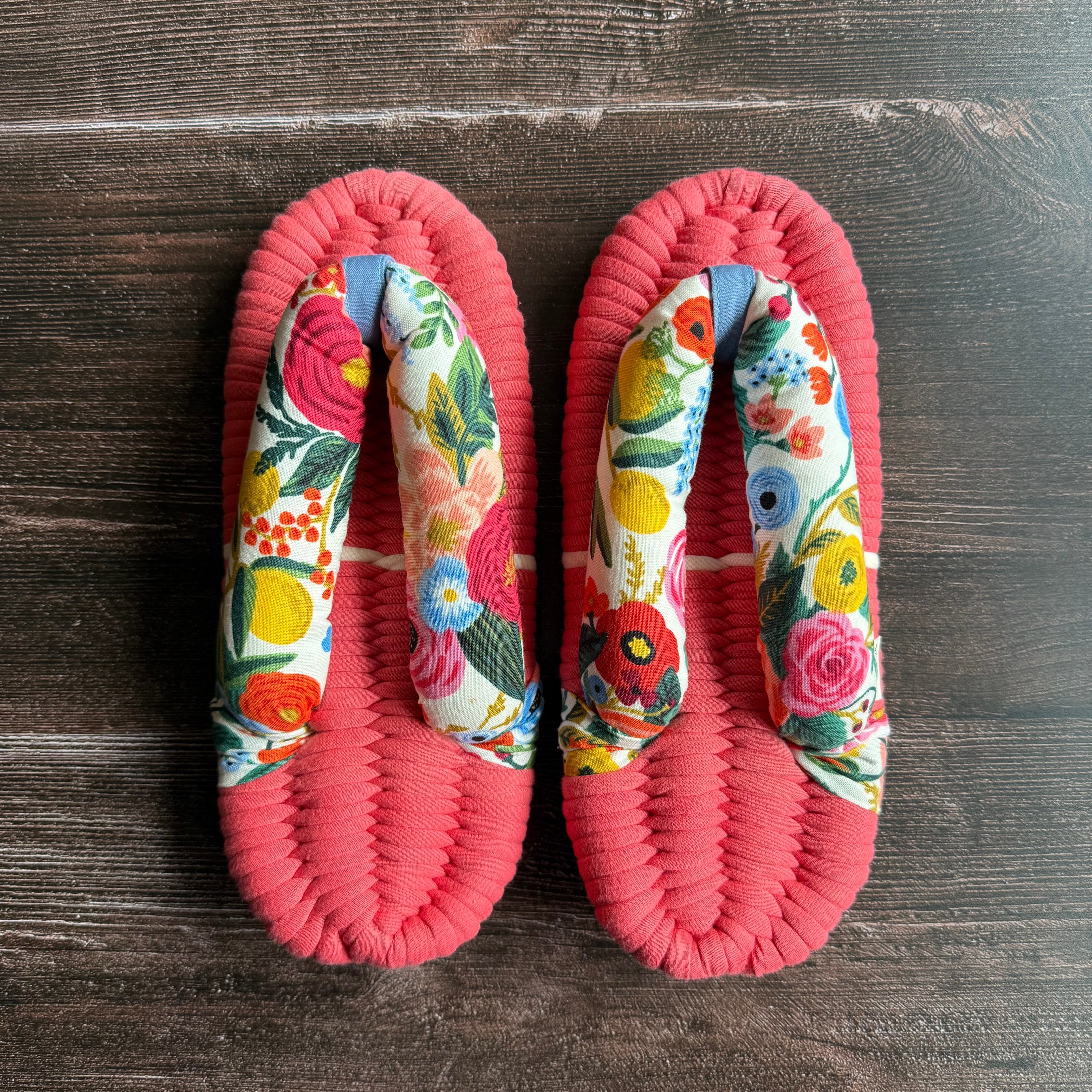 COTTON+STEELから発売された、アメリカのステーショナリーブランド Rifle Paper Co. がデザインした「Garden Partyで鼻緒を作りました。色鮮やかで華やかな花々が描かれた、ブランドを代表する人気の柄です。