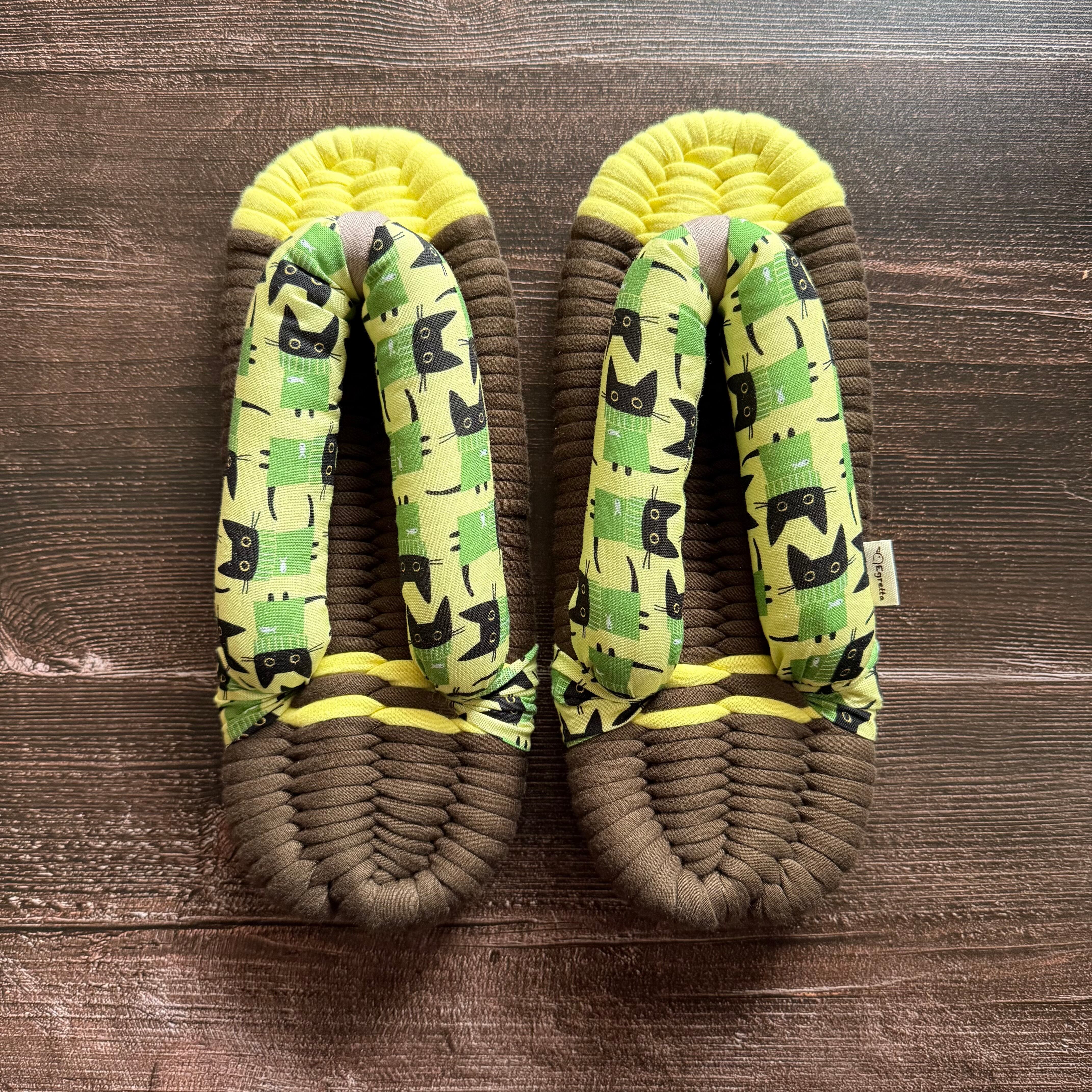 エグレッタの布ぞうりは、個性的で色鮮やかなUSAコットンで作られたふっくら鼻緒と、しっかりとした底の厚みが特徴の室内用です