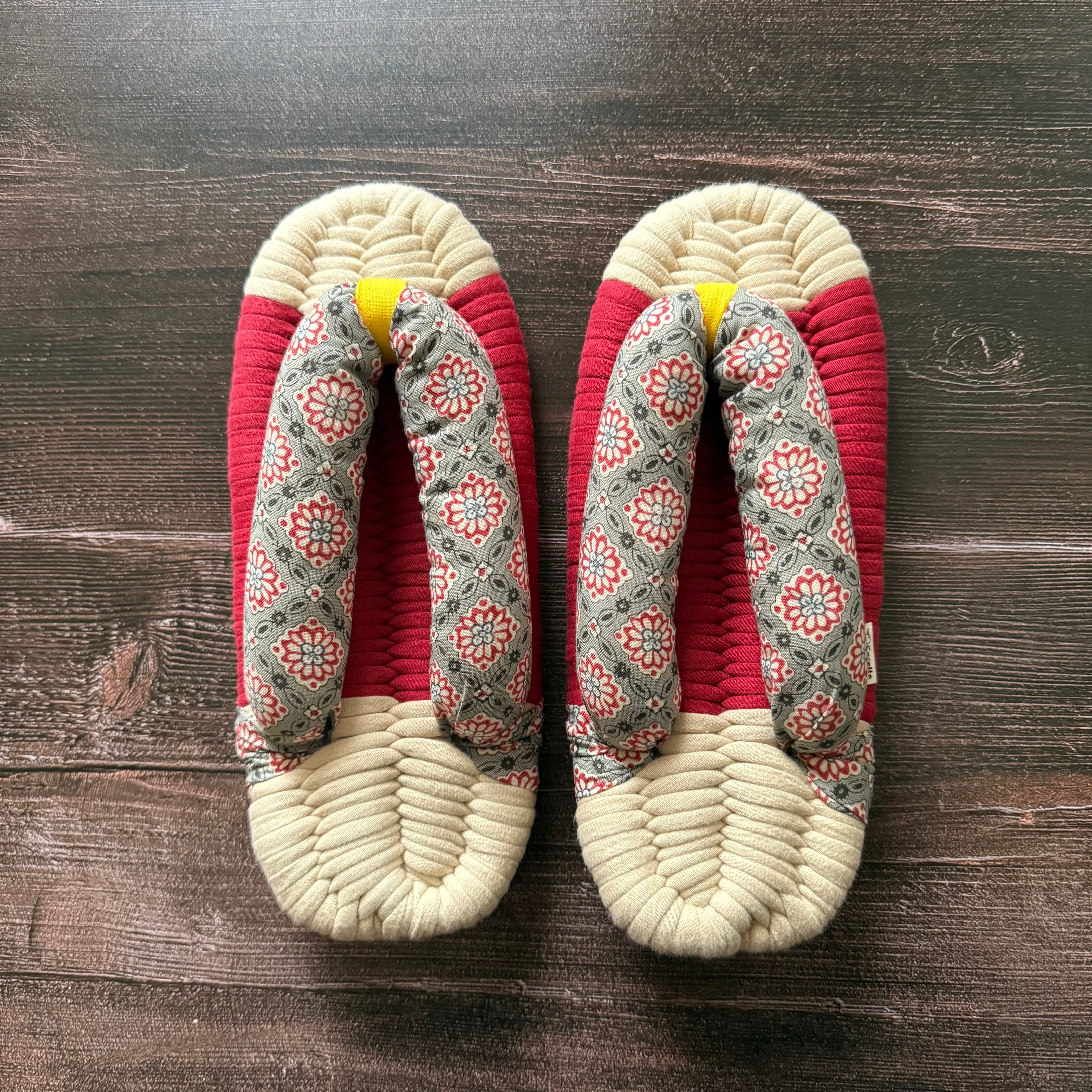 エグレッタの布ぞうりは、個性的で色鮮やかなUSAコットンで作られたふっくら鼻緒と、しっかりとした底の厚みが特徴の室内用布ぞうりです。