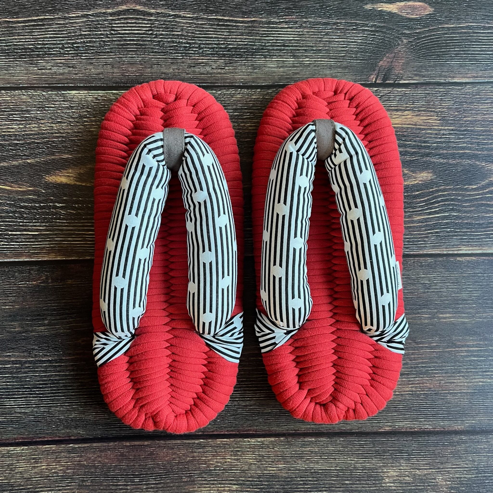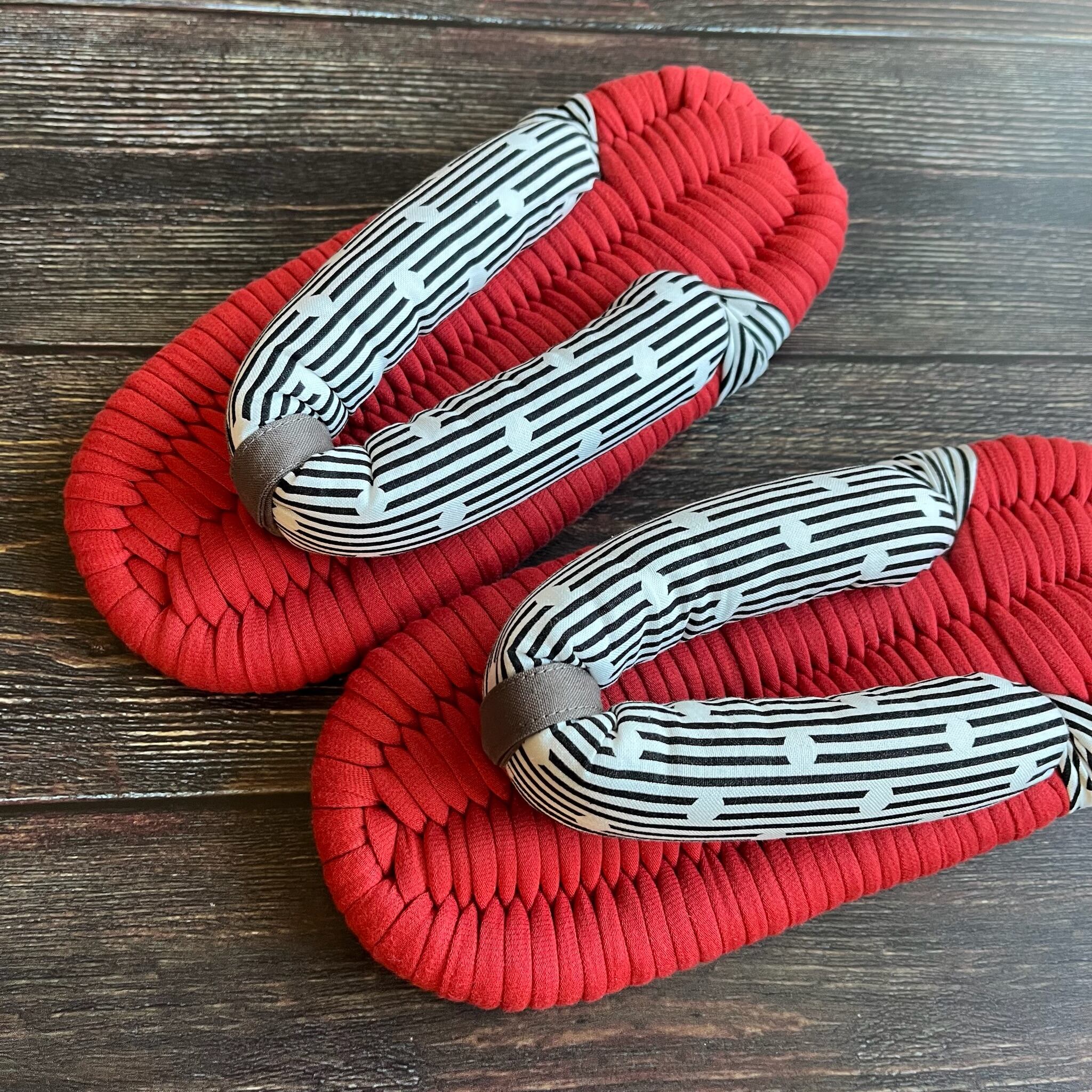 RileyBlakeのシーチング生地で鼻緒を作りました。Riley Blake Designsは、アメリカユタ州のアルパインを拠点とし品質の高いファブリックを提供する生地メーカーです。モノトーンのストライプとドット模様の組み合わせがモダンな一足です。