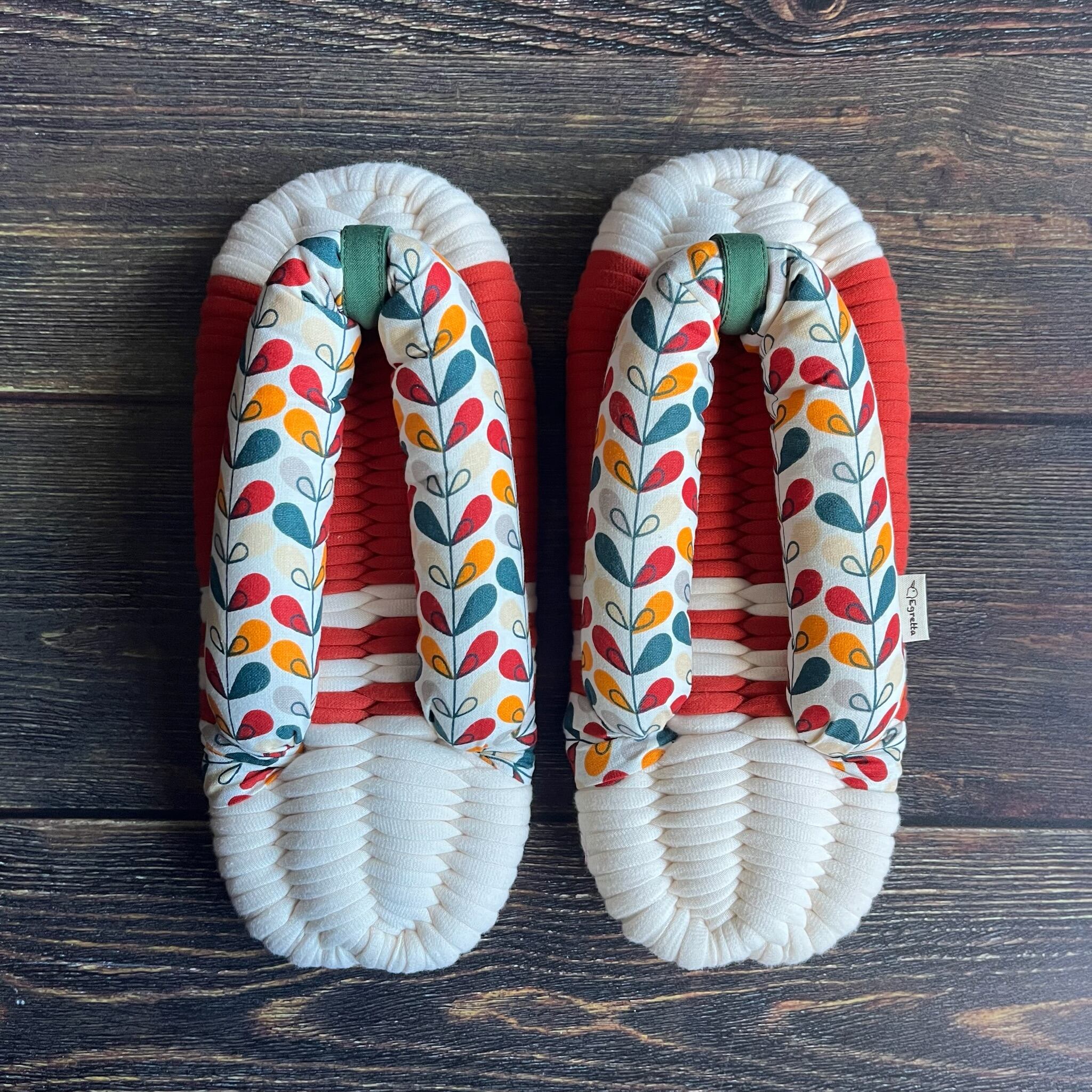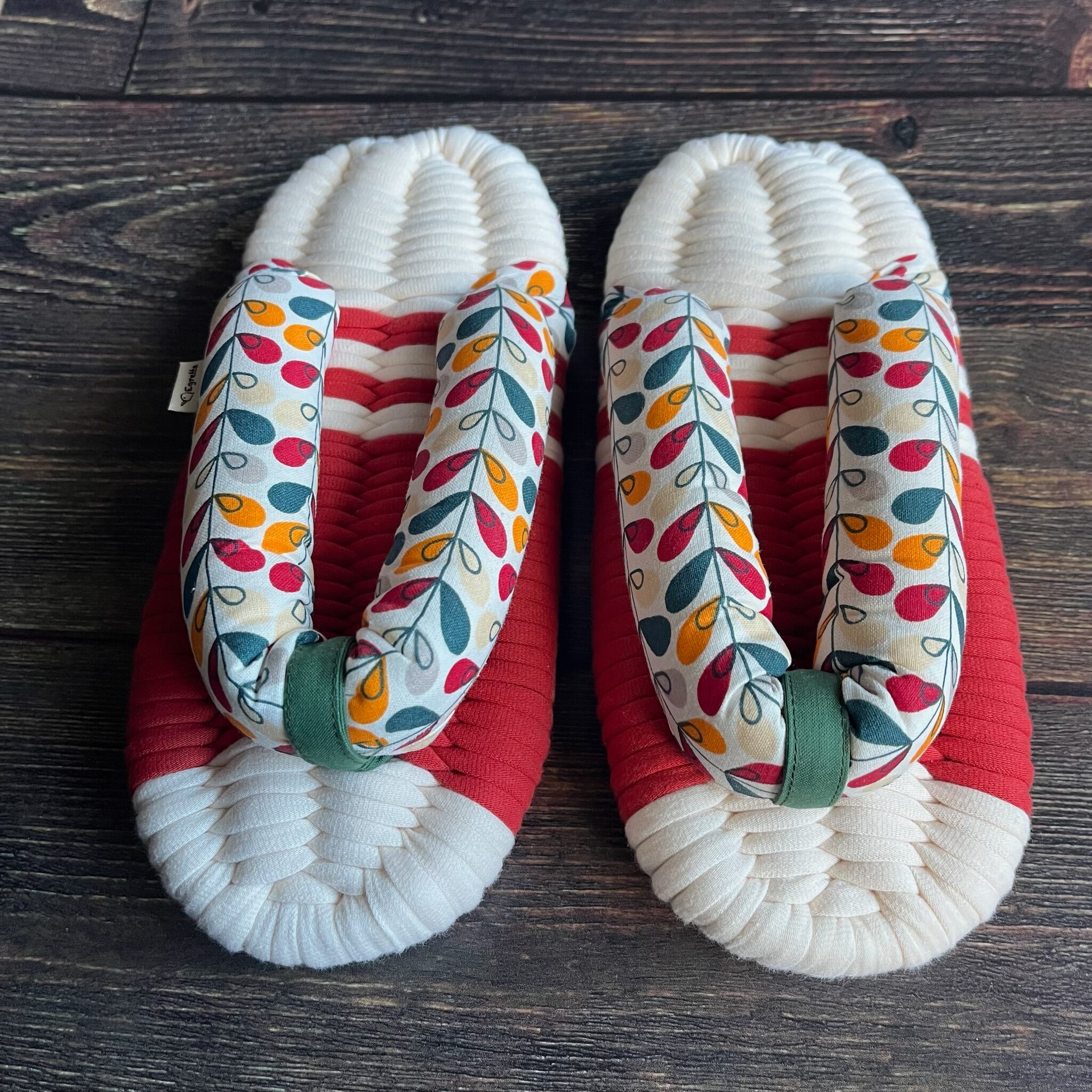 エグレッタの布ぞうりは、個性的で色鮮やかなコットンで作られたふっくら鼻緒と、しっかりとした底の厚みが特徴の室内用布ぞうりです。