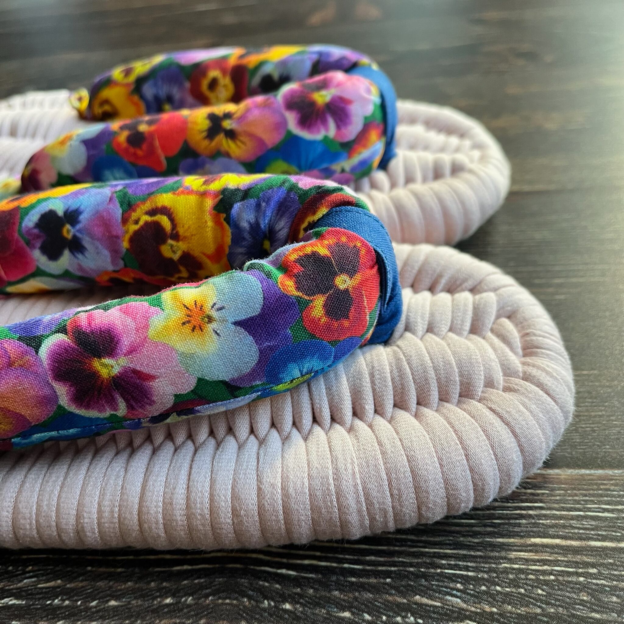 カラフルなパンジーがびっしり描かれたUSAコットンの鼻緒です。パンジー好きにはたまらないデザインです。
