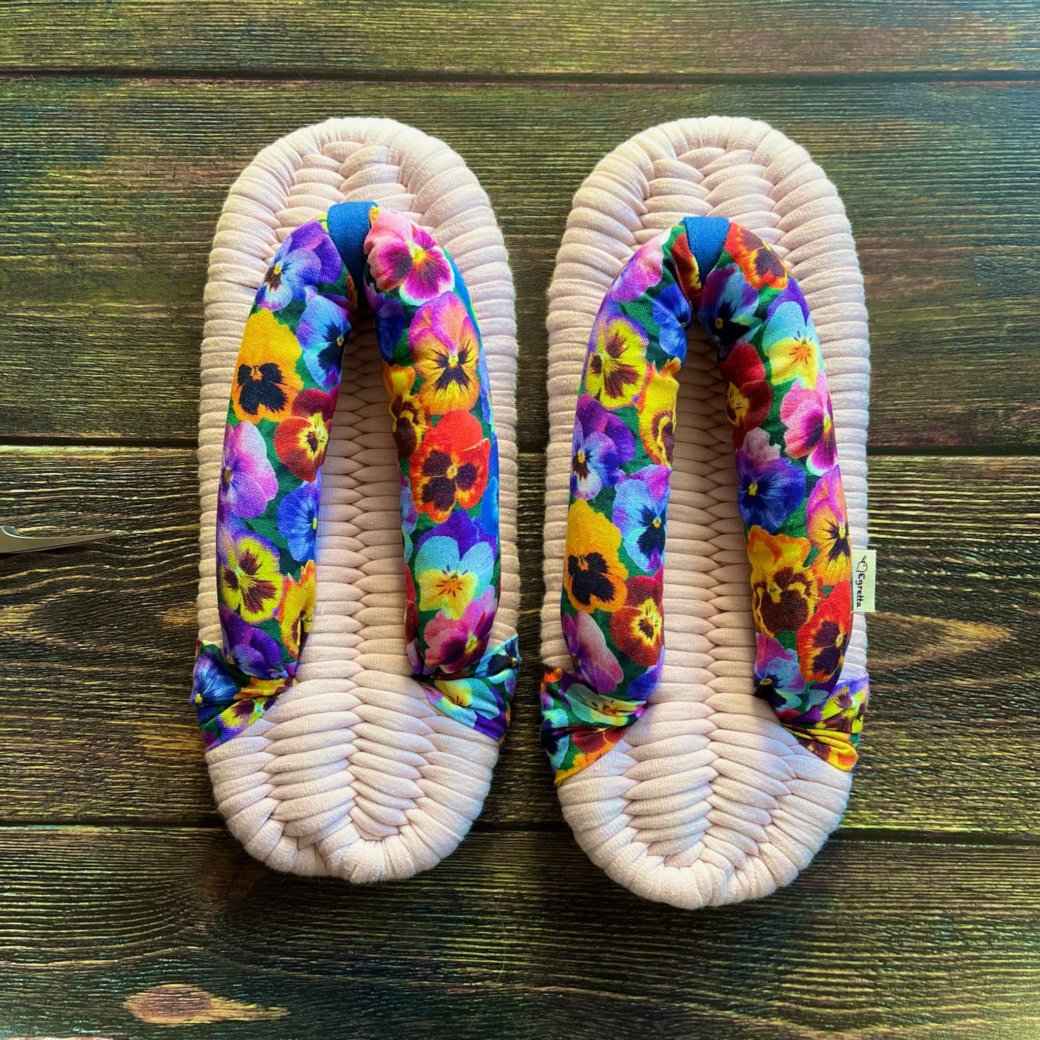 エグレッタの布ぞうりは、個性的で色鮮やかなUSAコットンで作られたふっくら鼻緒と、しっかりとした底の厚みが特徴の室内用布ぞうりです。