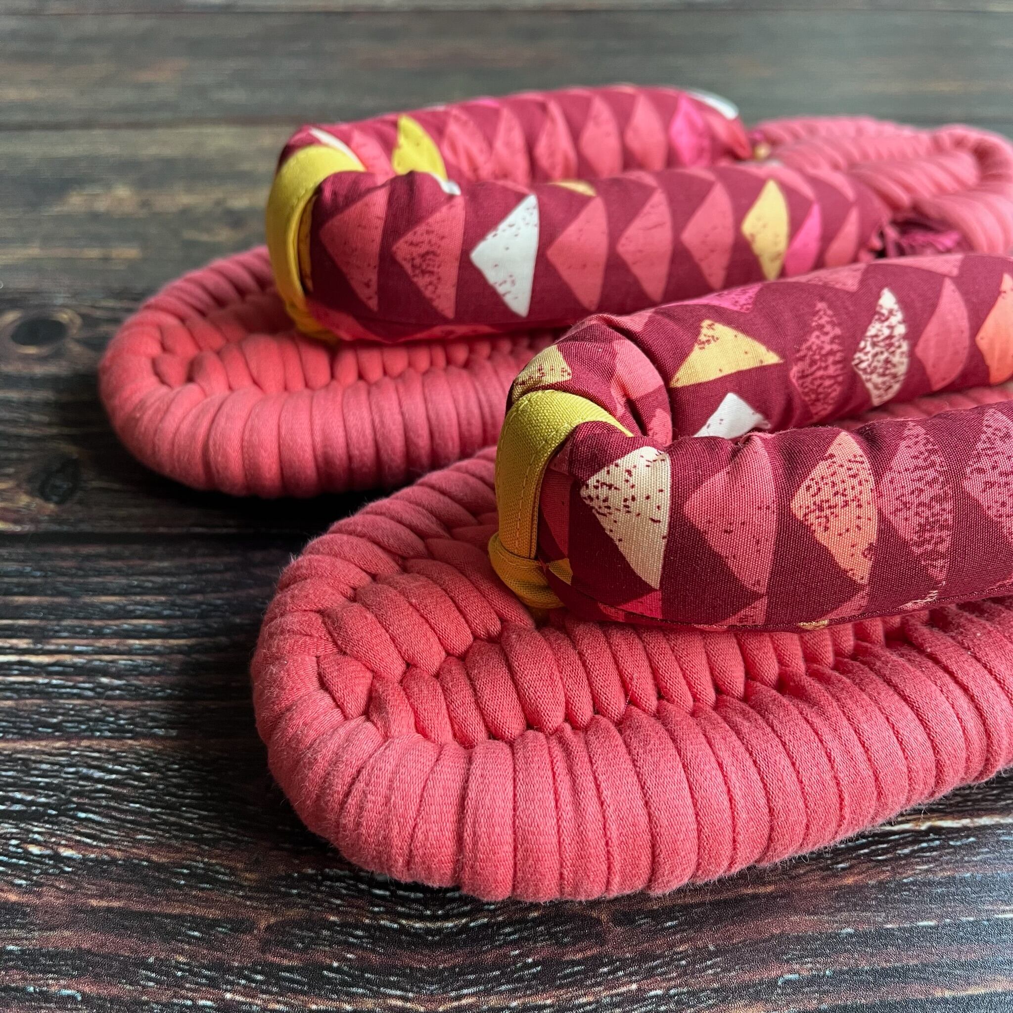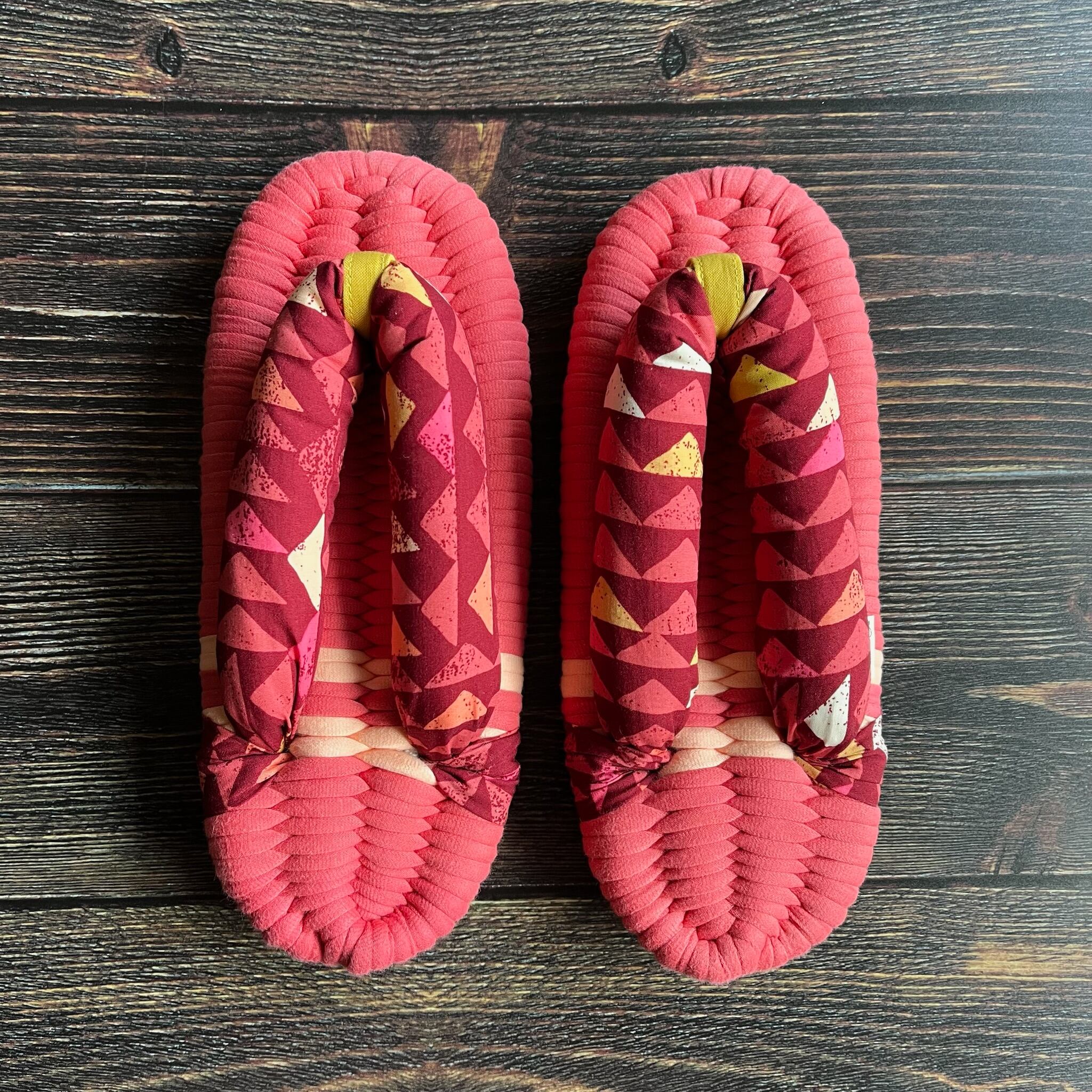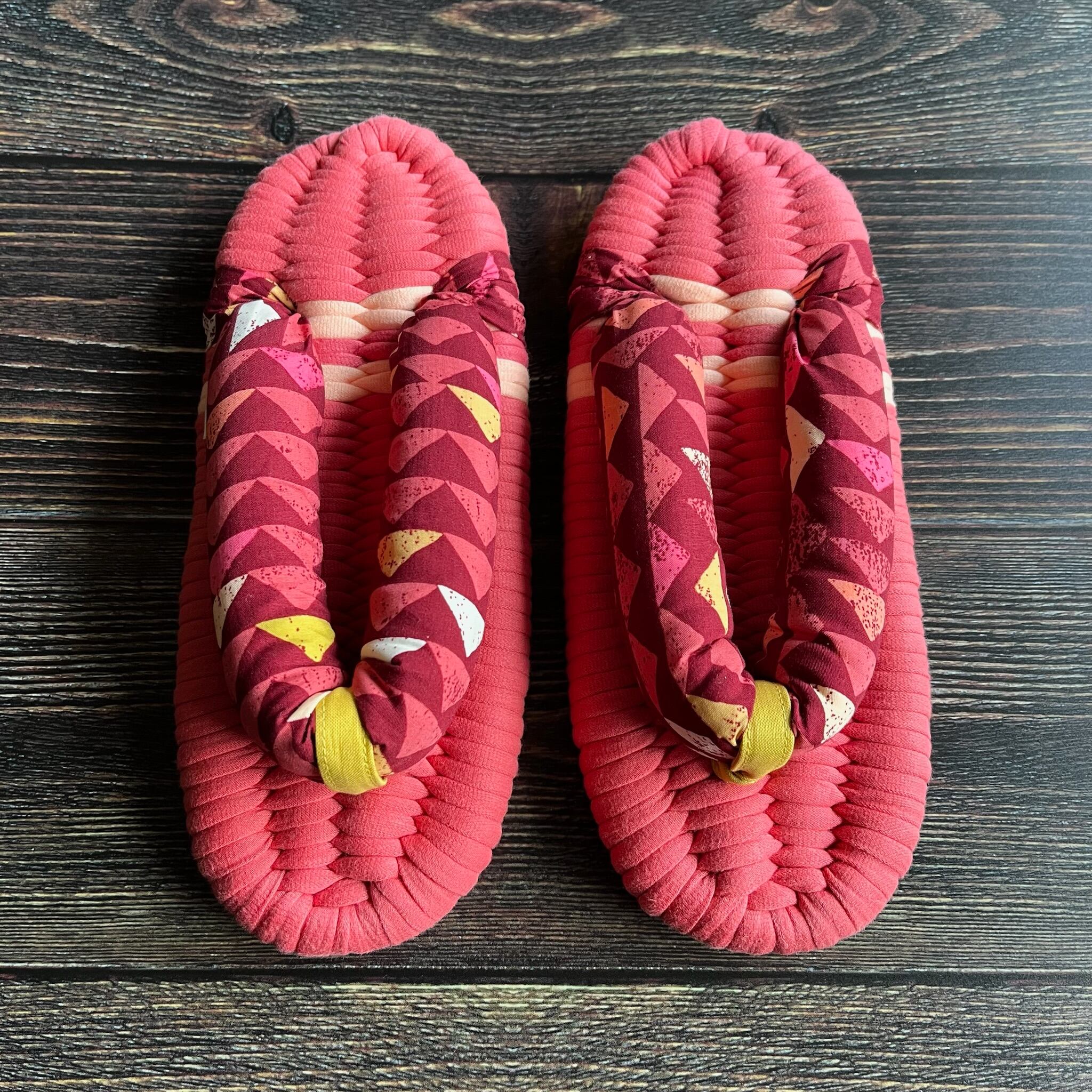 エグレッタの布ぞうりは、個性的で色鮮やかなUSAコットンで作られたふっくら鼻緒と、しっかりとした底の厚みが特徴の室内用布ぞうりです。