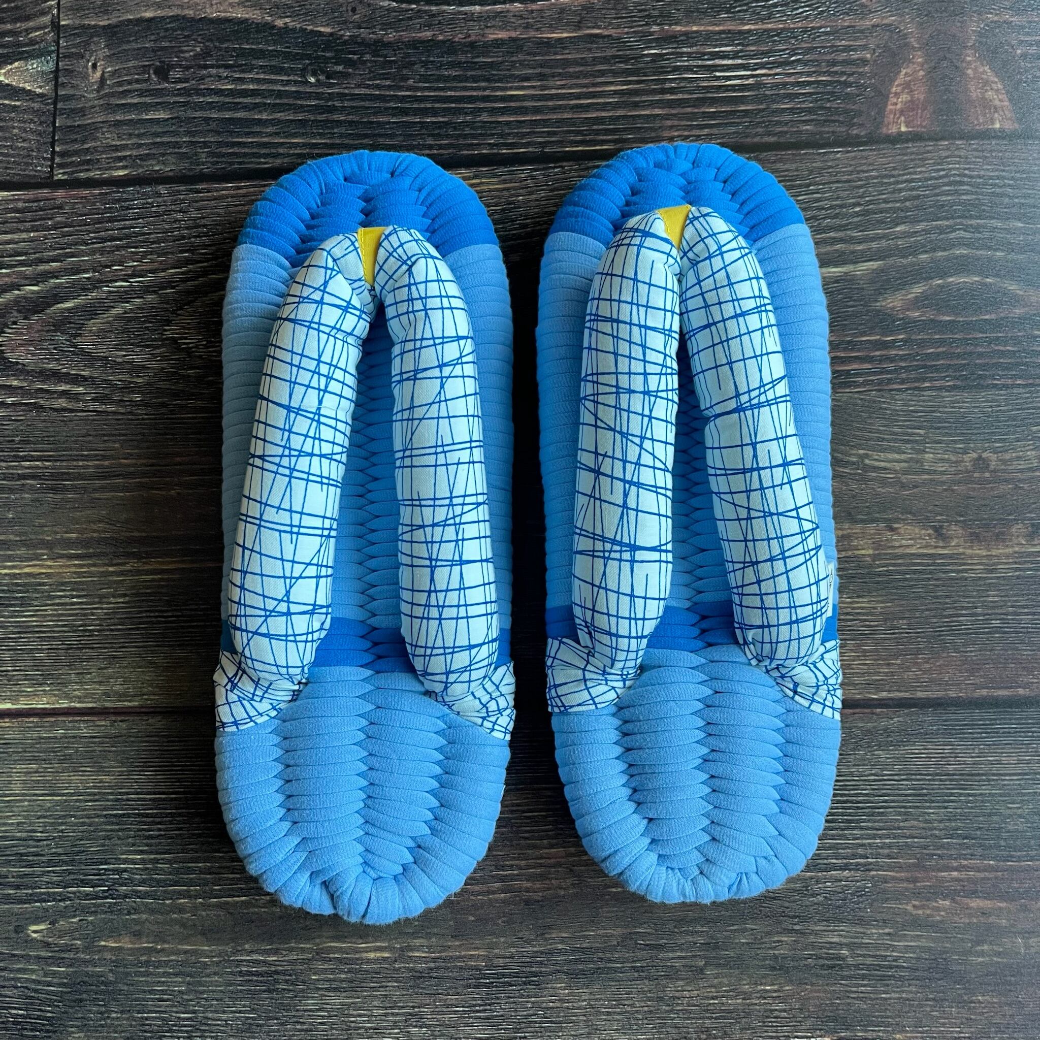 エグレッタの布ぞうりは、個性的で色鮮やかなUSAコットンで作られたふっくら鼻緒と、しっかりとした底の厚みが特徴の室内用布ぞうりです。