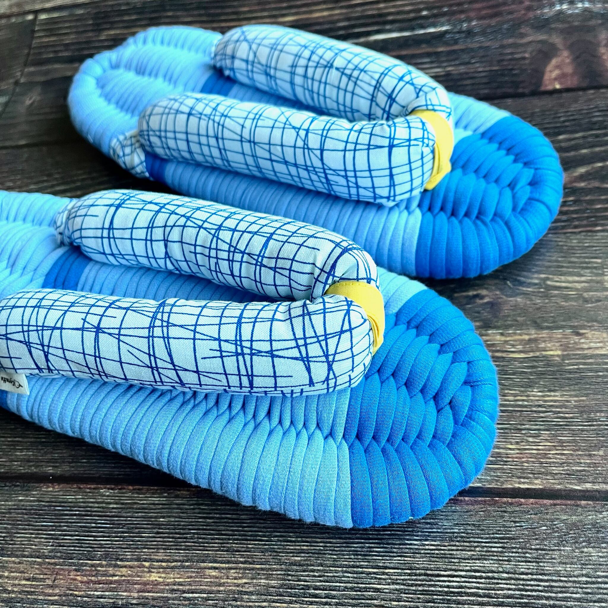 鼻緒はROBERT KAUFMANの生地で作りました。Robert Kaufman(ロバートカフマン)は、アメリカを代表する老舗ファブリックメーカー。ランダムに引かれたラインが個性的なデザインとなっています。