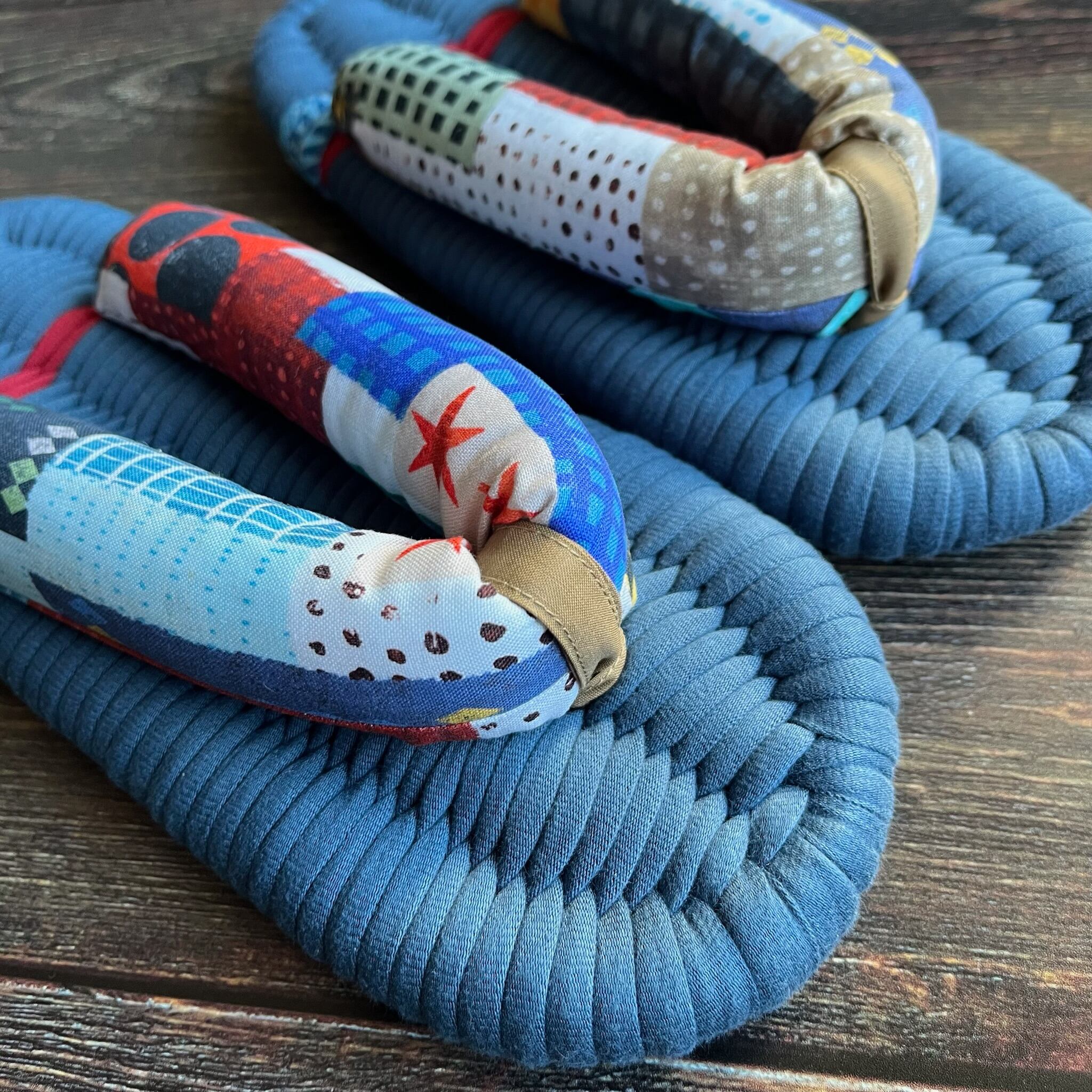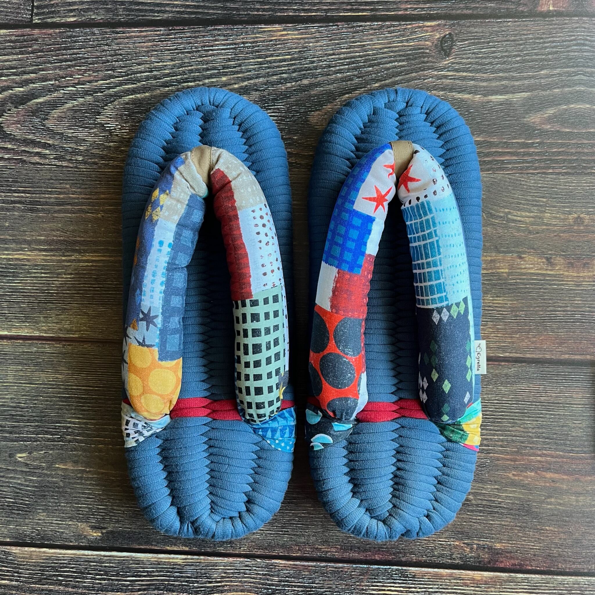 エグレッタの布ぞうりは、個性的で色鮮やかなUSAコットンで作られたふっくら鼻緒と、しっかりとした底の厚みが特徴の室内用布ぞうりです。