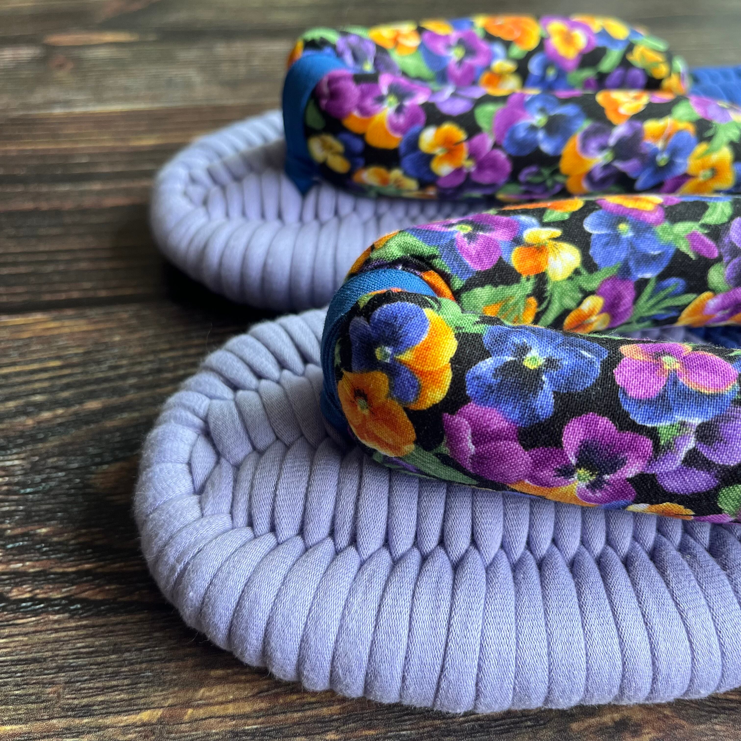 Elizabeth's Studioの生地で鼻緒を作りました。小さなパンジーが生地いっぱいに描かれた可憐なデザインです。