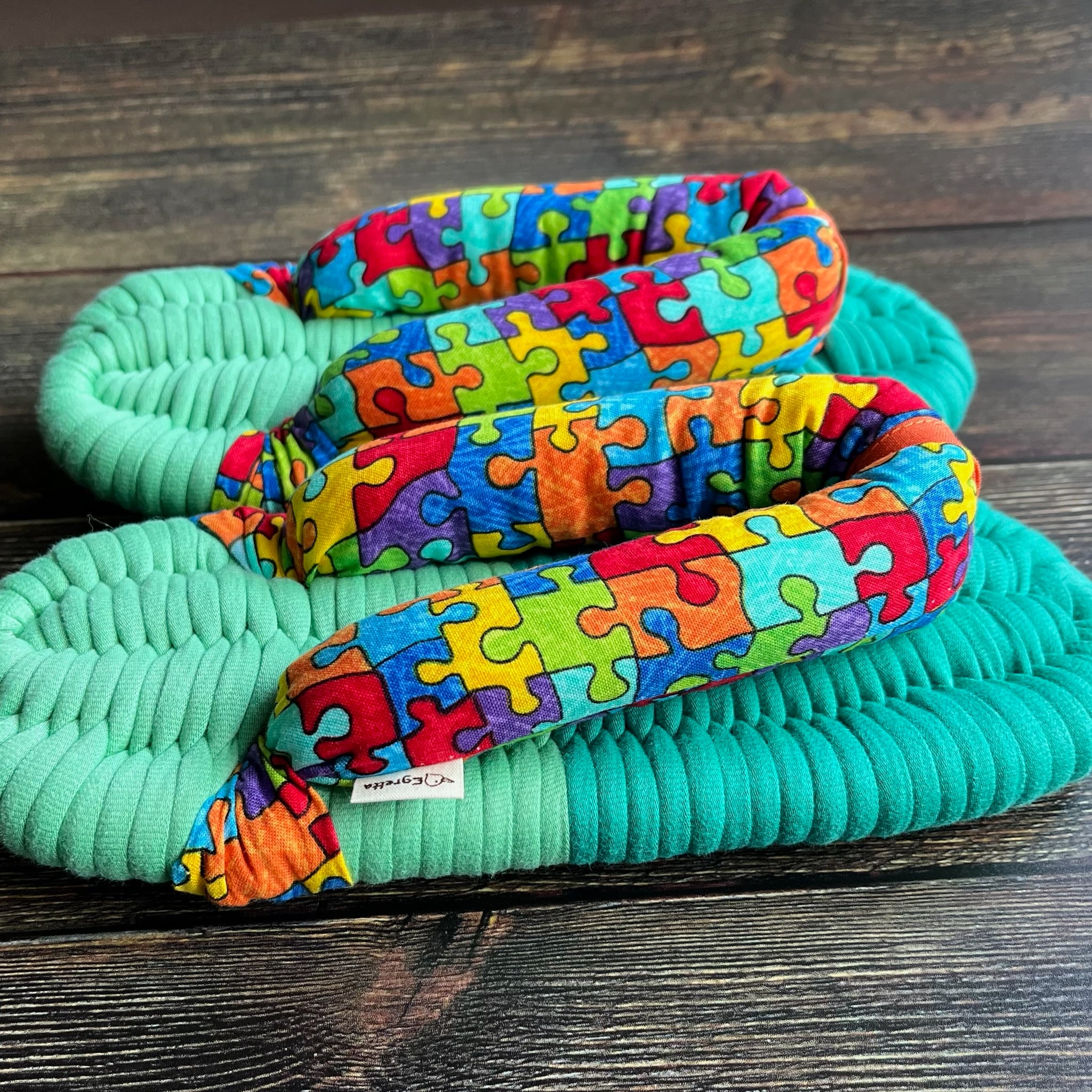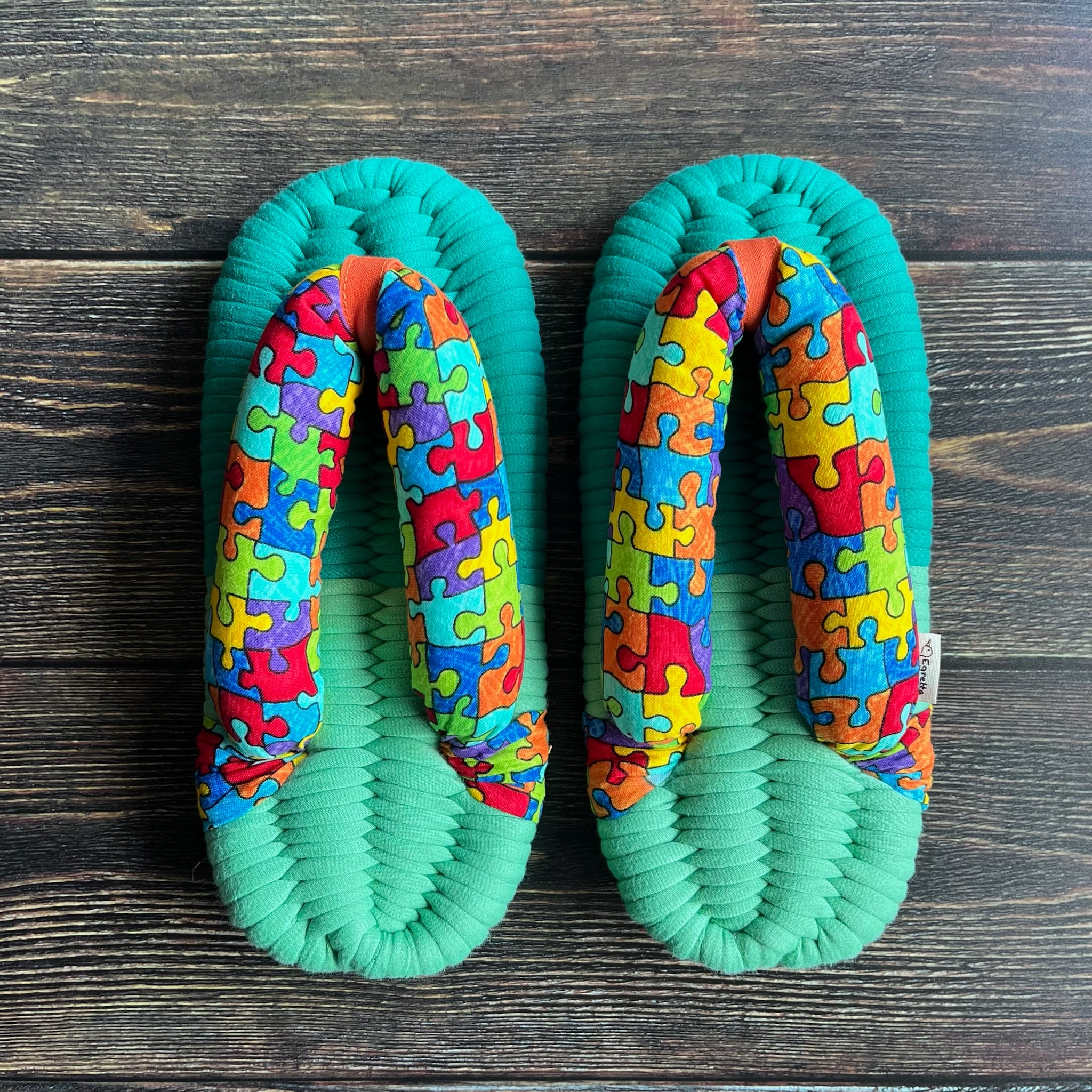 TimeLess Treasuresの色鮮やかなグリーンのツートンカラーのベースに可愛らしいジグソーパズル柄で鼻緒を作りました。Timeless Treasures は1968年にニューヨークで設立されたメーカーで、創造性に富んだ楽しく遊び心のあるプリントで知られ、世界中のソーイング愛好家から愛されており、日本でも大人気のメーカーです。