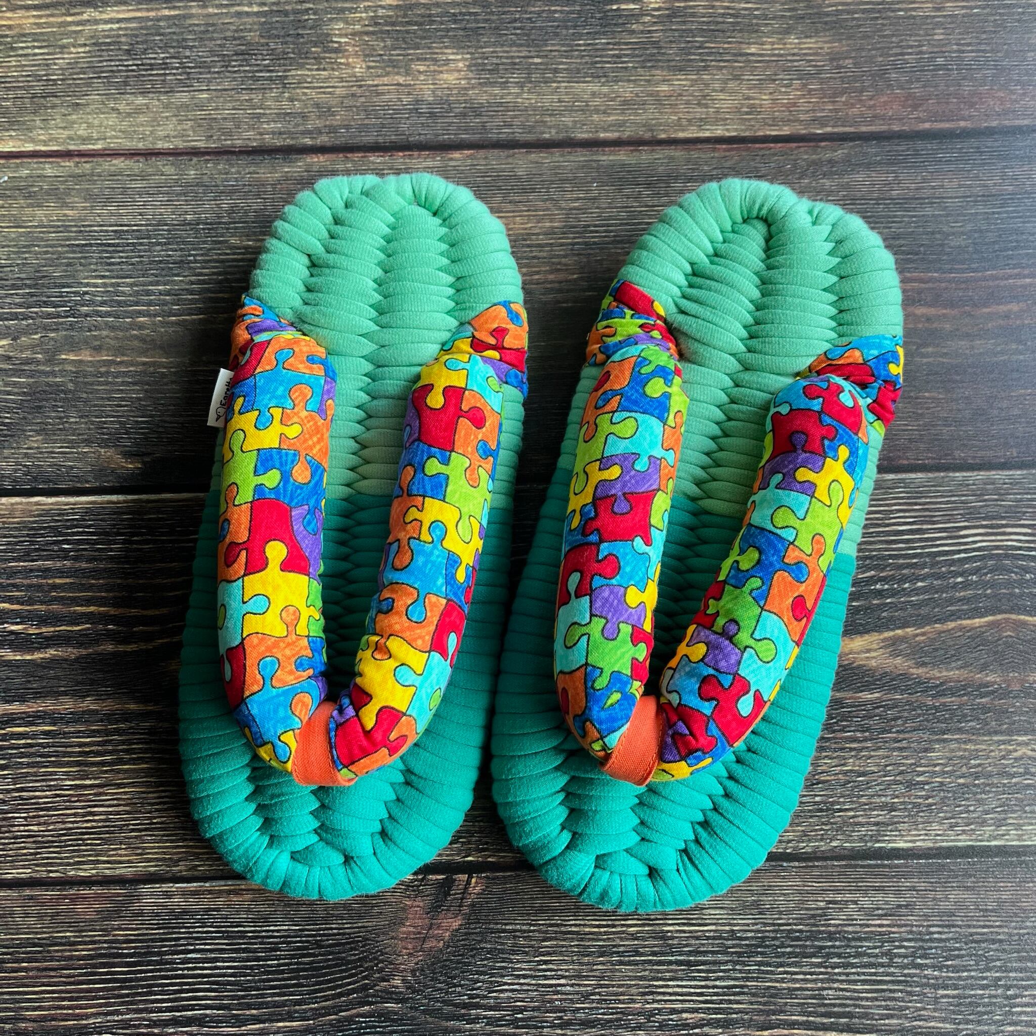 エグレッタの布ぞうりは、個性的で色鮮やかなUSAコットンで作られたふっくら鼻緒と、しっかりとした底の厚みが特徴の室内用布ぞうりです。