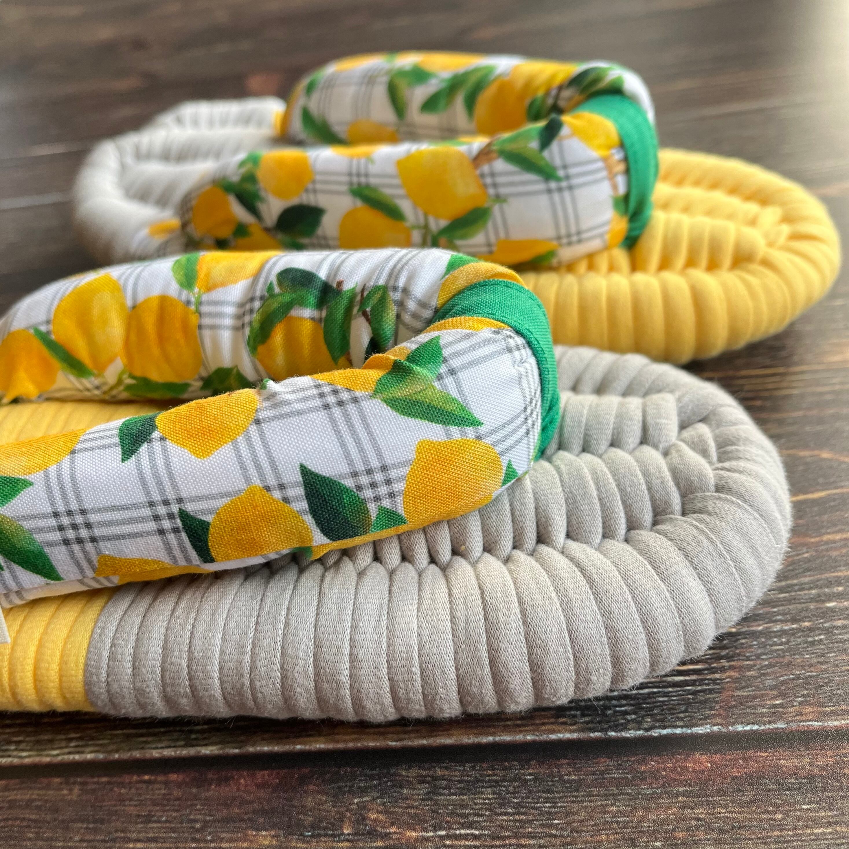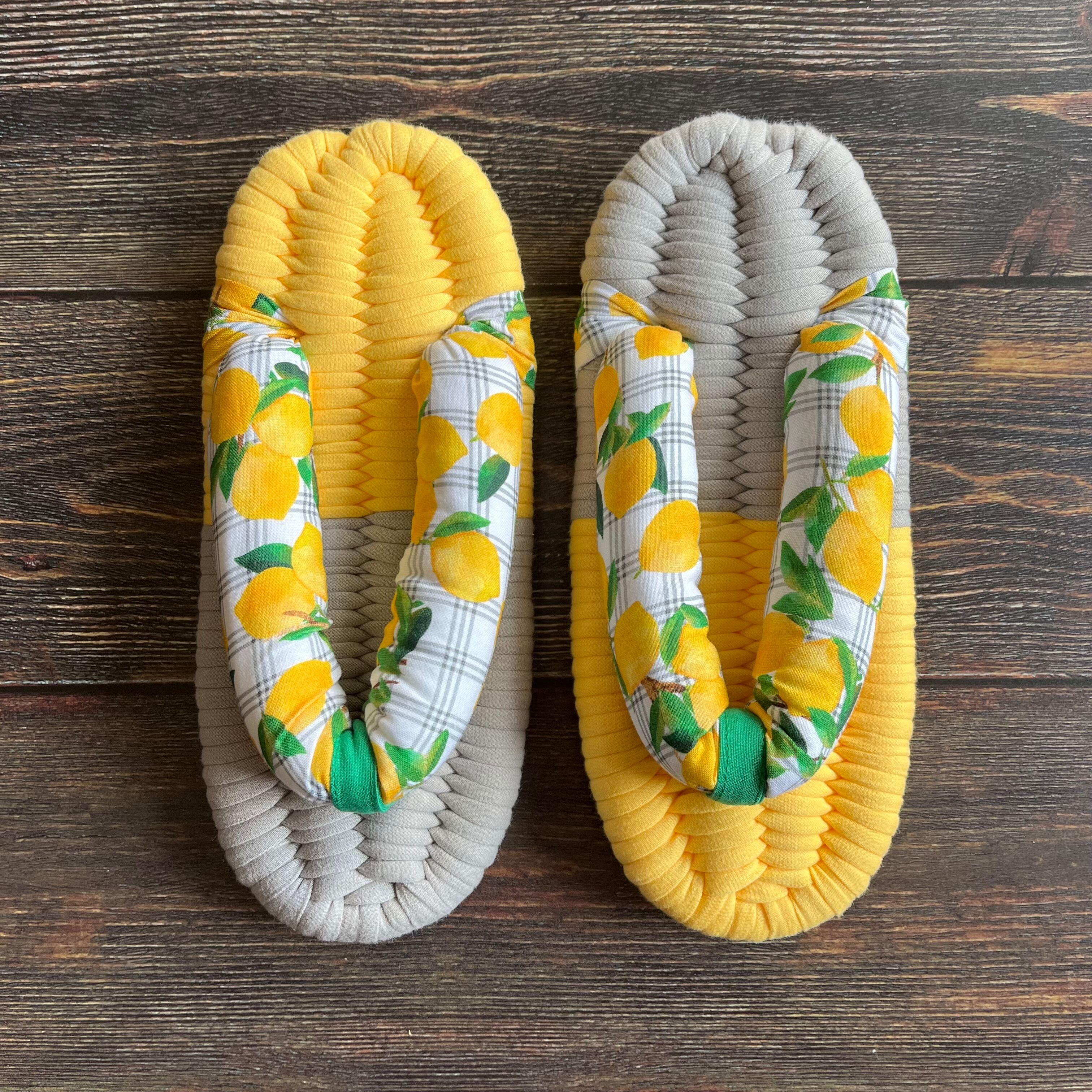 アメリカの3wishes fabric社の生地で鼻緒を作りました。レモンイエローとグレーの上品なベースに、さわやかで可憐なレモン柄が涼しげです。