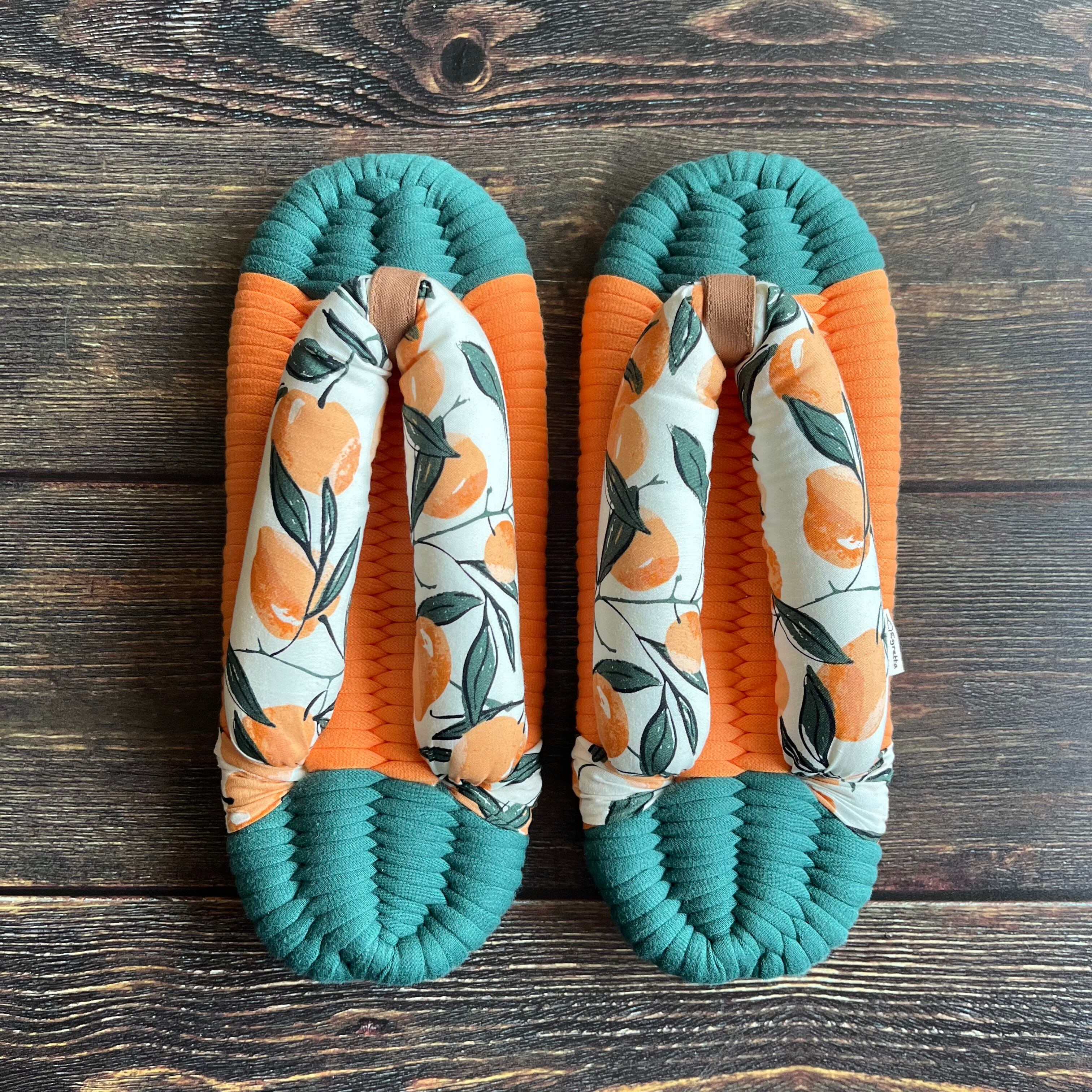 エグレッタの布ぞうりは、個性的で色鮮やかなUSAコットンで作られたふっくら鼻緒と、しっかりとした底の厚みが特徴の室内用布ぞうりです。