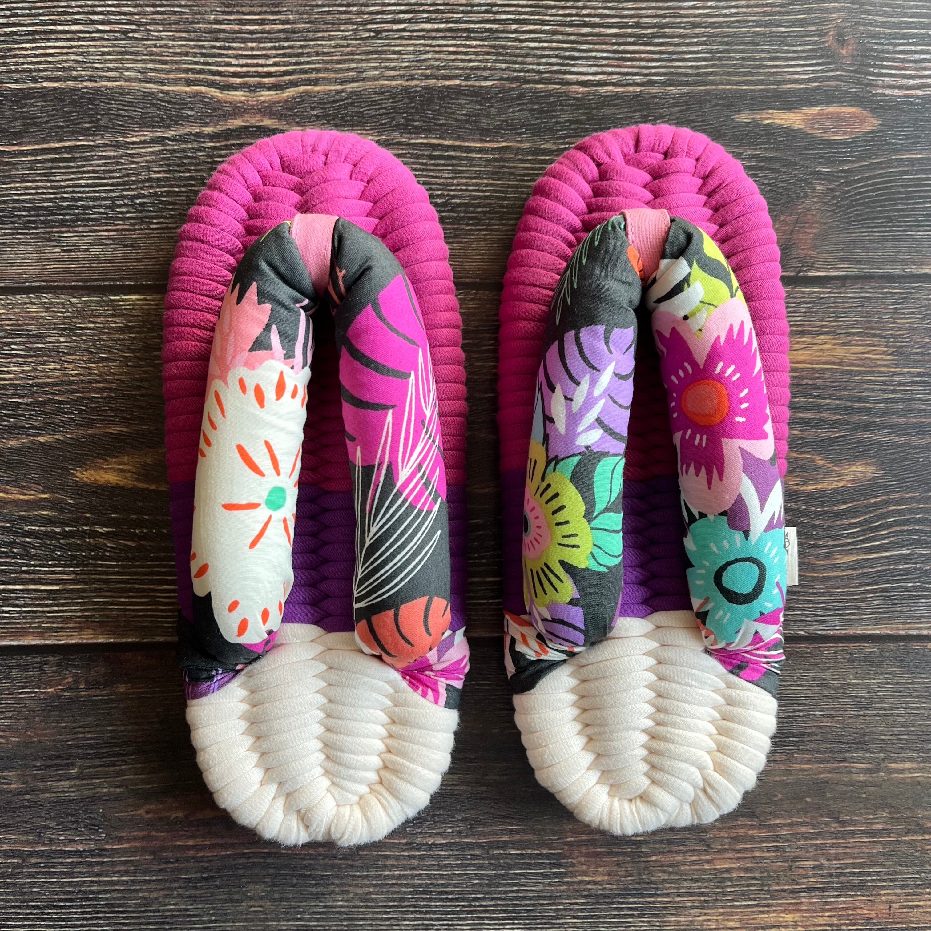 エグレッタの布ぞうりは、個性的で色鮮やかなUSAコットンで作られたふっくら鼻緒と、しっかりとした底の厚みが特徴の室内用布ぞうりです。