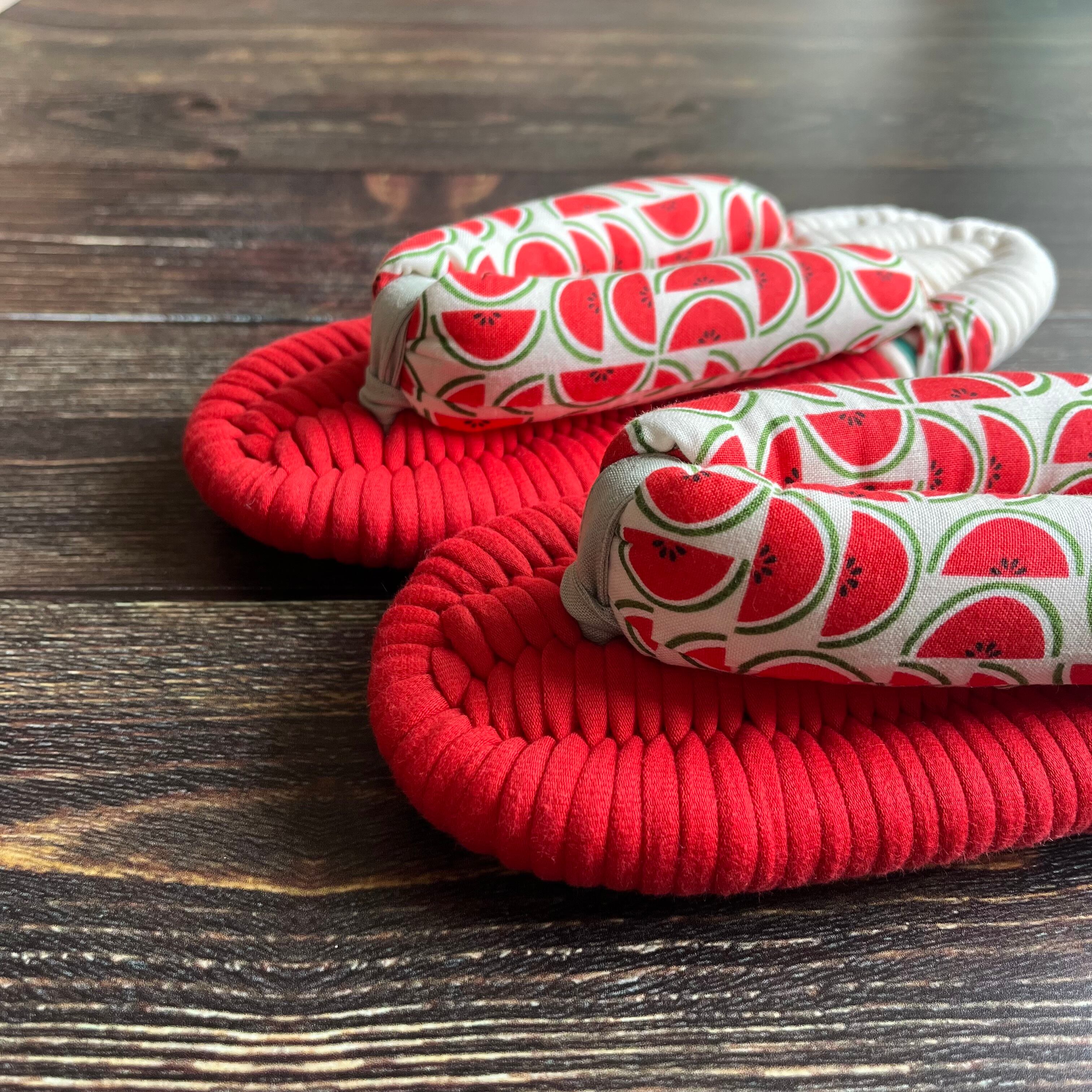 Moda社のあざやかなレッドのスイカ柄の生地で鼻緒を作りました。Moda社はテキサス州ダラスを拠点とするファブリックブランドです。年間で1200柄を超える新作を次々にリリースし多彩なバリエーションで魅了し続けています。見ているだけで元気になれそうなPOPなデザインです。