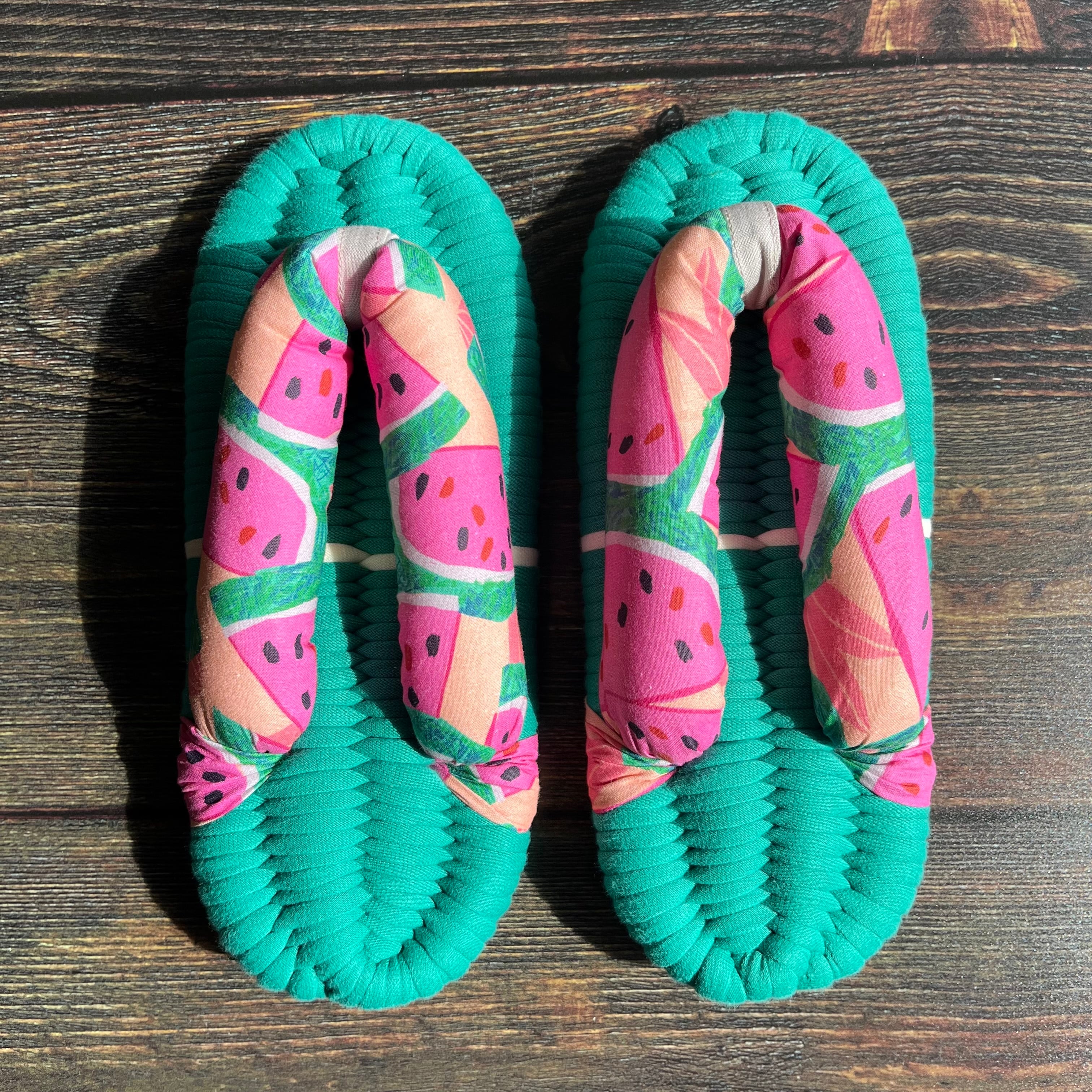 Paintbrush Studio社のスイカ柄のシーチング生地で鼻緒を仕立てました。Fabri-Quilt, Inc.のディヴィジョンとして発足したノースカンザスシティを拠点とするファブリックブランドです。新世代のデザイナーを起用して生み出される作品は世界中から注目されています。ピンク色とミントグリーン色のPOPな組み合わせは、夏に大人気の配色です。