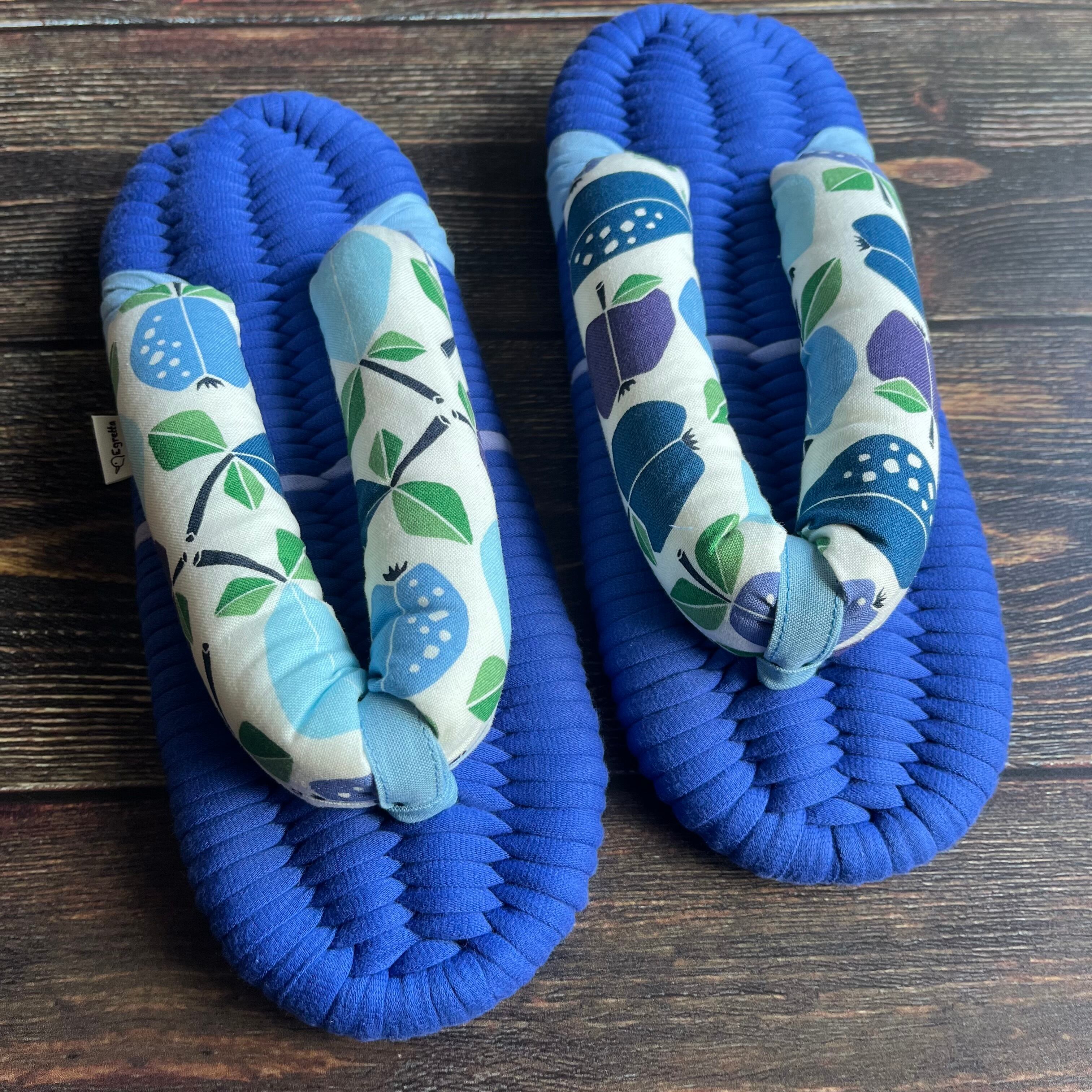 エグレッタの布ぞうりは、個性的で色鮮やかなUSAコットンで作られたふっくら鼻緒と、しっかりとした底の厚みが特徴の室内用布ぞうりです。