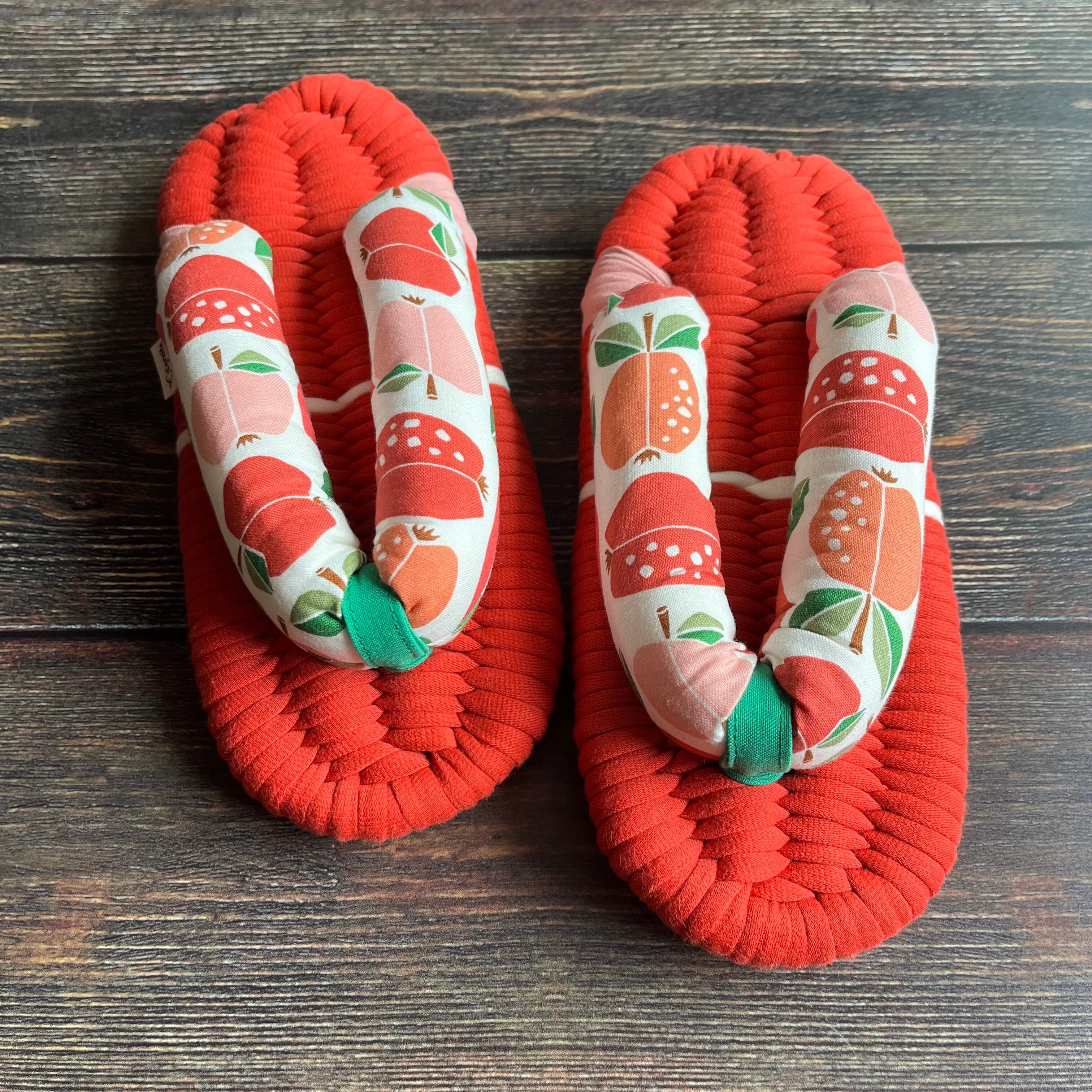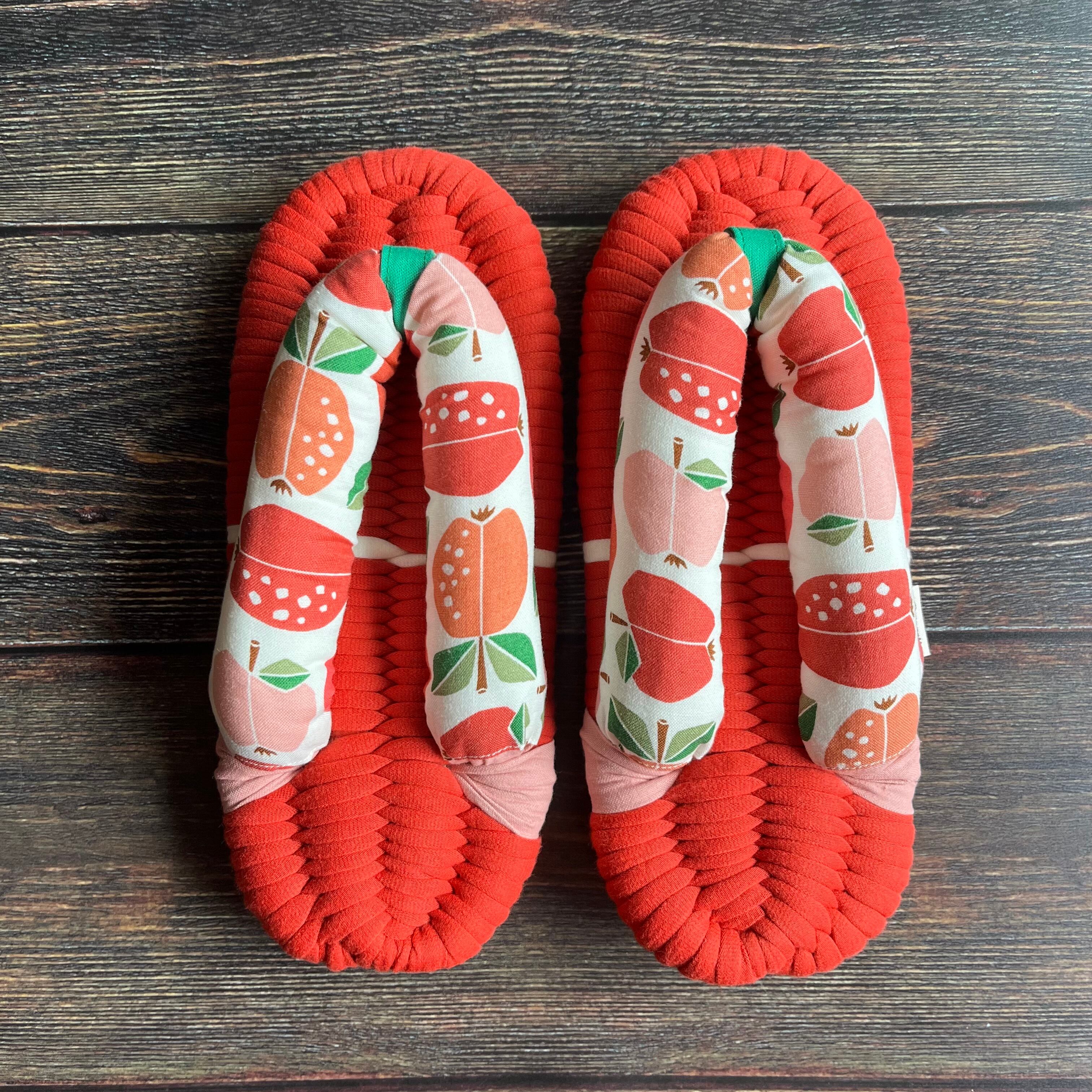 エグレッタの布ぞうりは、個性的で色鮮やかなUSAコットンで作られたふっくら鼻緒と、しっかりとした底の厚みが特徴の室内用布ぞうりです。