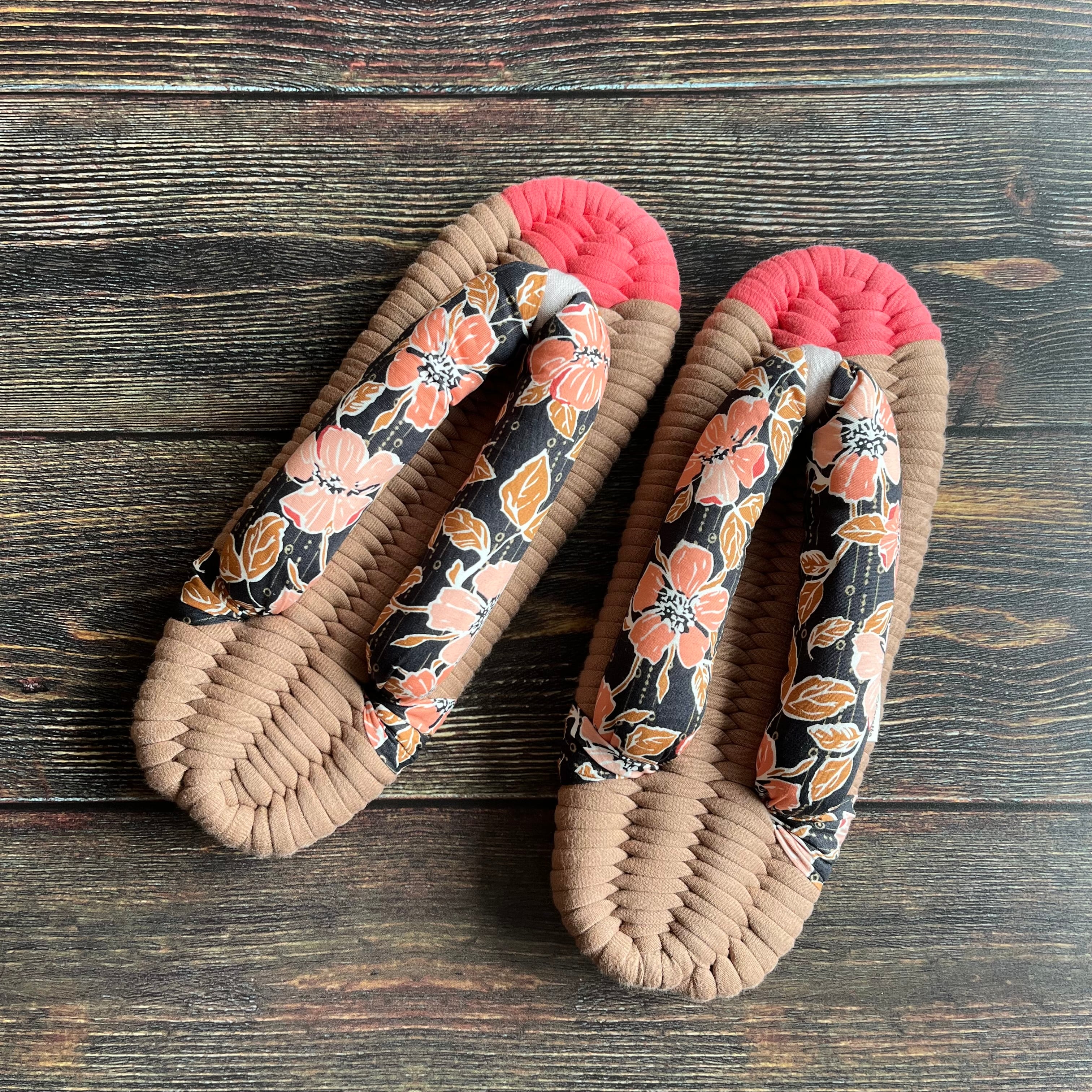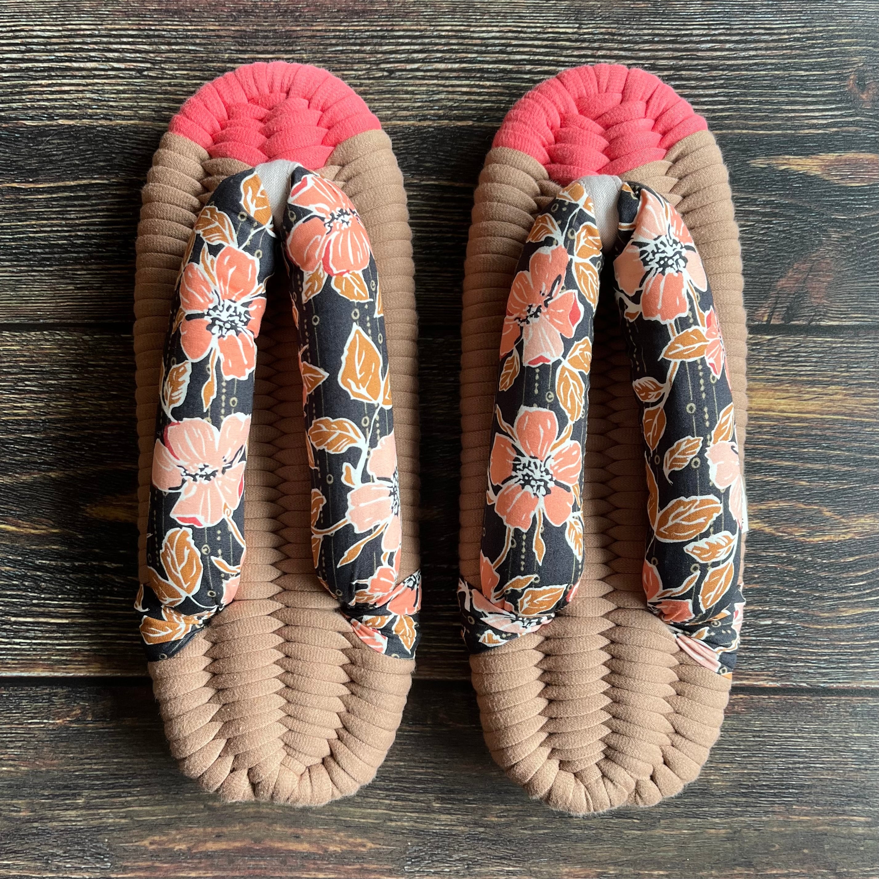 エグレッタの布ぞうりは、個性的で色鮮やかなUSAコットンで作られたふっくら鼻緒と、しっかりとした底の厚みが特徴の室内用布ぞうりです。