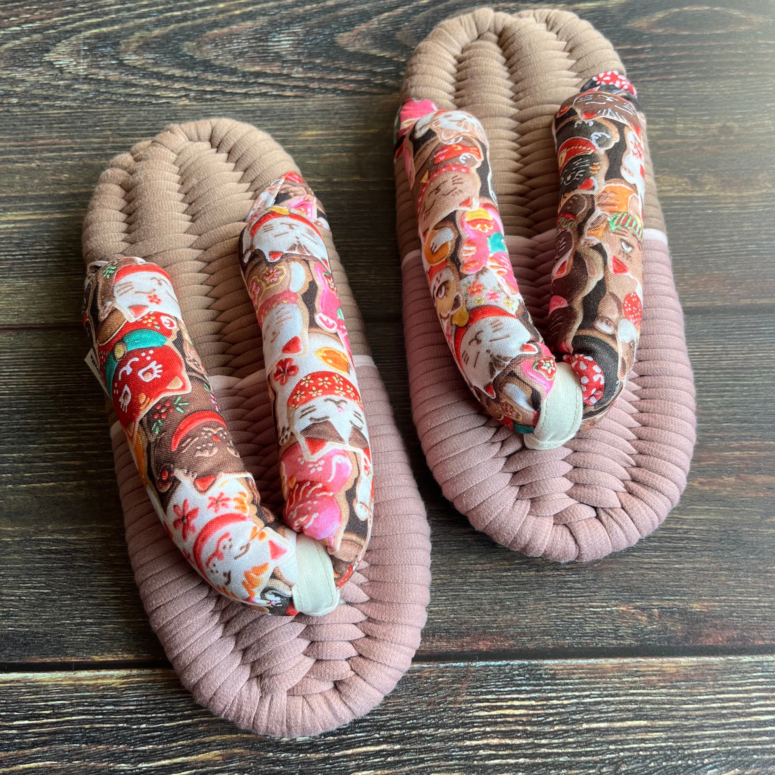 robert kaufman社の招き猫のアイシングクッキーの生地を鼻緒に仕立てました。Robert Kaufman(ロバートカフマン)は、アメリカを代表する老舗ファブリックメーカー。レアなデザインに釘付けです。