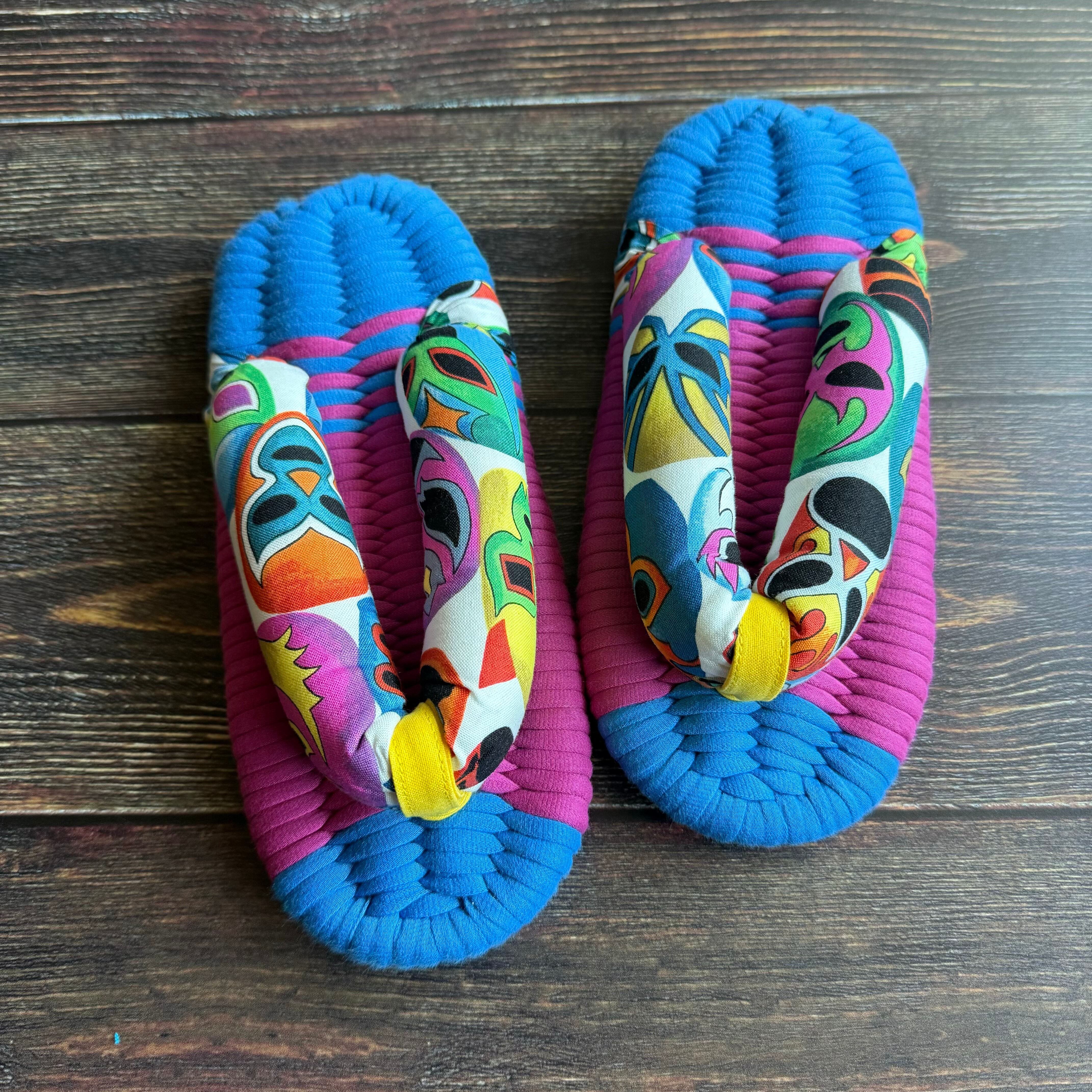 エグレッタの布ぞうりは、個性的で色鮮やかなUSAコットンで作られたふっくら鼻緒と、しっかりとした底の厚みが特徴の室内用布ぞうりです。