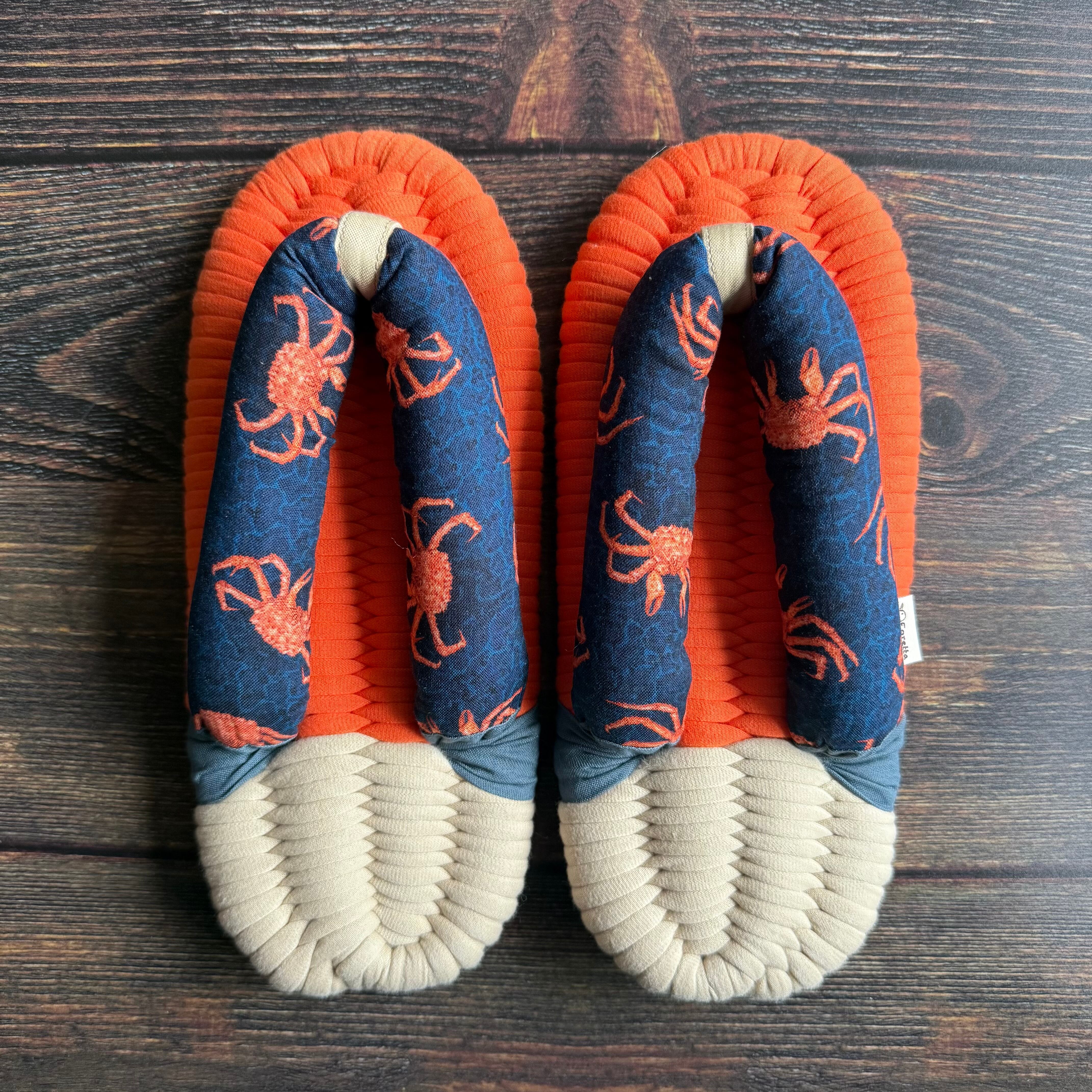 エグレッタの布ぞうりは、個性的で色鮮やかなUSAコットンで作られたふっくら鼻緒と、しっかりとした底の厚みが特徴の室内用布ぞうりです。